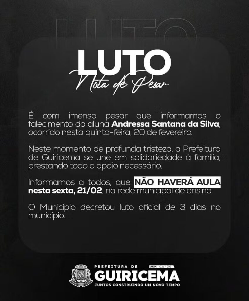 A Prefeitura de Guiricema divulgou nas redes sociais uma nota de pesar e disse que as aulas nas escolas municipais nesta sexta-feira (21) foram suspensas.