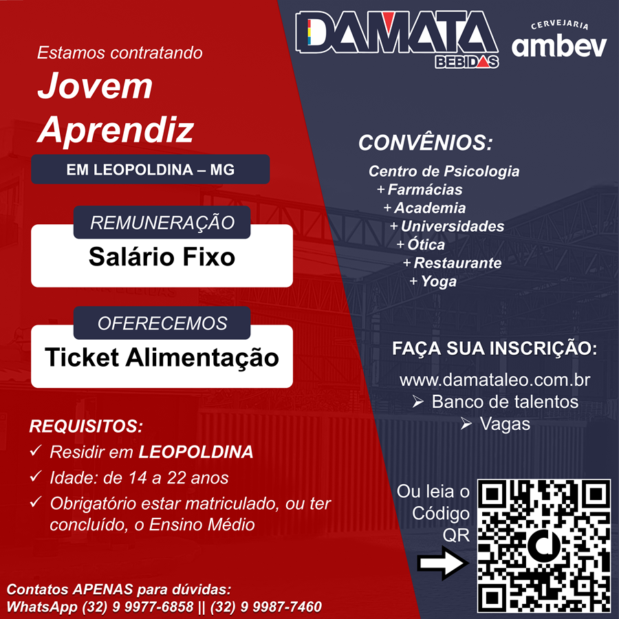 A DAMATA Bebidas divulgou a abertura de vaga para Jovem Aprendiz em Leopoldina.