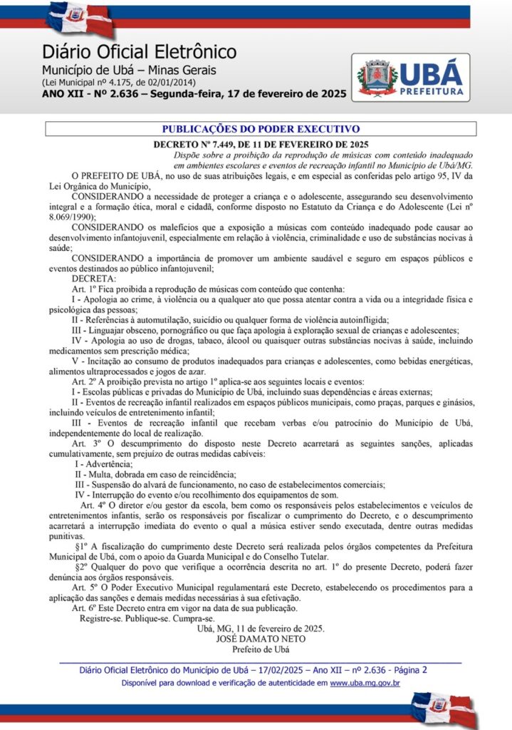 O prefeito de Ubá, José Damato Neto (à direita na foto acima), também seguiu a mesma tendência e publicou um decreto, na última segunda-feira, 17 de fevereiro, proibindo a reprodução de “músicas com conteúdo inadequado” em ambientes escolares e eventos de recreação infantil.
