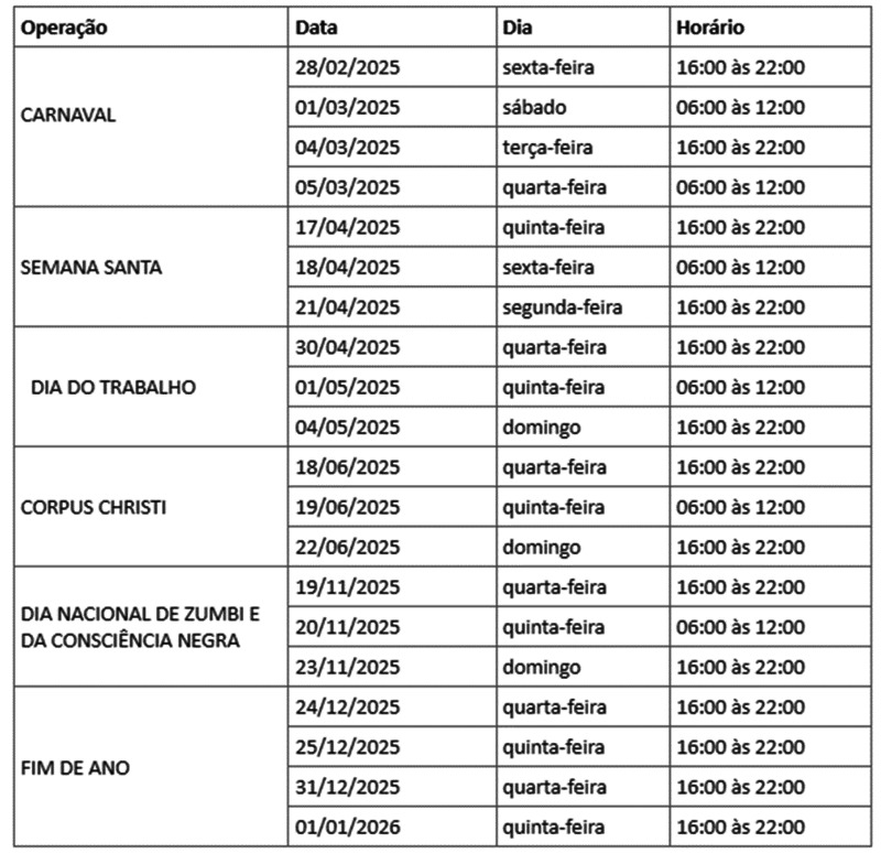 A medida, definida pela portaria nº 4162, de 24/2/2025, e publicada nesta terça-feira (25), no Diário Oficial, começa a valer para o feriado de Carnaval, conforme o quadro abaixo.