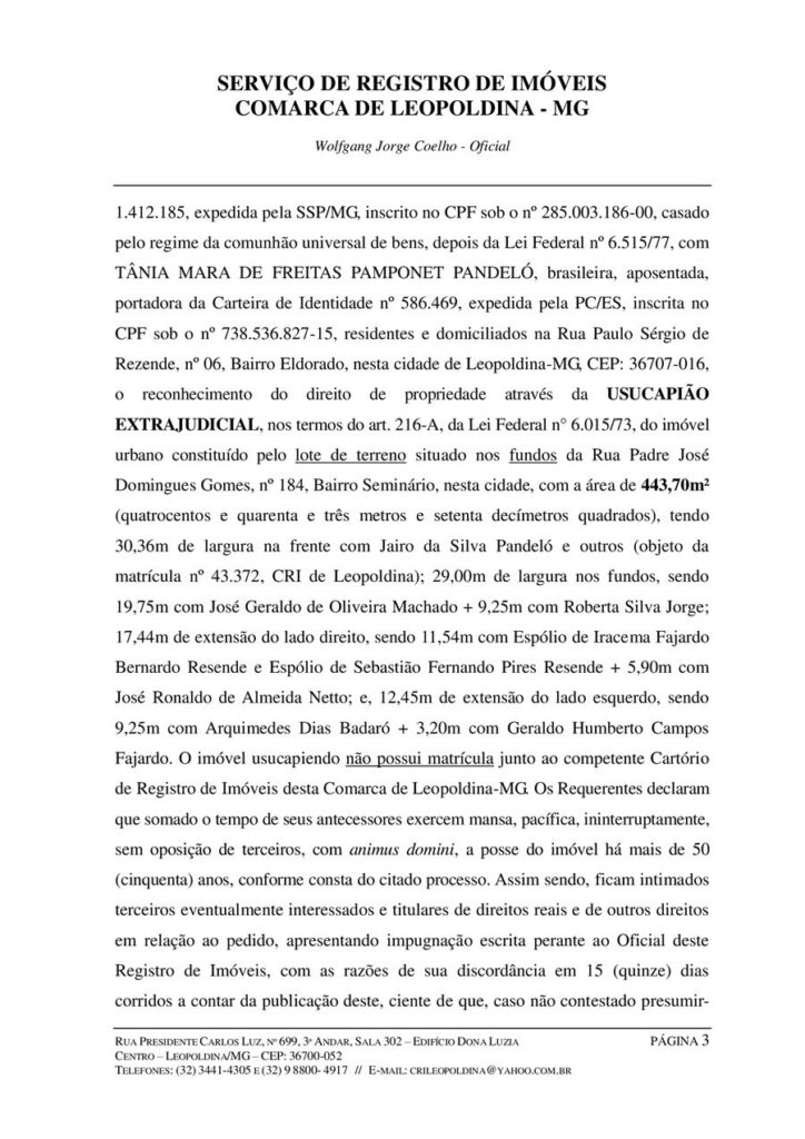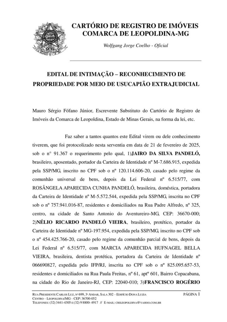 Faz saber a tantos quantos este Edital virem ou dele conhecimento tiverem, que foi protocolizado nesta serventia em data de 21 de fevereiro de 2025, sob o n° 91.367 o requerimento pelo qual, 1)JAIRO DA SILVA PANDELÓ, brasileiro, aposentado, portador da Carteira de Identidade nº M-7.686.915, expedida pela SSP/MG, inscrito no CPF sob o nº 120.114.606-20, casado pelo regime da comunhão universal de bens, depois da Lei Federal nº 6.515/77, com ROSÂNGELA APARECIDA CUNHA PANDELÓ, brasileira, doméstica, portadora da Carteira de Identidade nº M-5.572.544, expedida pela SSP/MG, inscrita no CPF sob o nº 757.941.016-87, residentes e domiciliados na Rua Padre Alfredo, nº 325, centro, na cidade de Santo Antonio do Aventureiro-MG, CEP: 36670-000; 2)NÉLIO RICARDO PANDELÓ VIEIRA, brasileiro, protético, portador da Carteira de Identidade nº MG-197.954, expedida pela SSP/MG, inscrito no CPF sob o nº 454.425.766-20, casado pelo regime da comunhão parcial de bens, depois da Lei Federal nº 6.515/77, com MARCIA APARECIDA HUFNAGEL BELLA VIEIRA, brasileira, dentista protética, portadora da Carteira de Identidade nº 066690827, expedida pelo IFP/RJ, inscrita no CPF sob o nº 825.095.657-53, residentes e domiciliados na Rua Paula Freitas, nº 61, aptº 601, Bairro Copacabana, na cidade do Rio de Janeiro-RJ, CEP: 22040-010; 3)FRANCISCO ROGÉRIO PANDELÓ VIEIRA, brasileiro, aposentado, portador da Carteira de Identidade nº 21.949.064-8, expedida pela SSP/SP, inscrito no CPF sob o nº 366.395.164-20, casado pelo regime da comunhão parcial de bens, depois da Lei Federal nº 6.515/77, com MARISTANE MOREIRA RESENDE, brasileira, aposentada, portadora da Carteira de Identidade nº 24.694.713-9, expedida pelo DETRAN/RJ, inscrita no CPF sob o nº 562.934.296-72, residentes e domiciliados na Rua Aquidabã, nº 1.102, aptº 601, Gr 1, Bairro Meier, na cidade do Rio de Janeiro-RJ, CEP: 20720-293; 4)ROSELY APARECIDA PANDELÓ VIEIRA, brasileira, dentista, portadora da Carteira de Identidade nº MG-3.997.758, expedida pela SSP/MG, inscrita no CPF sob o nº 559.448.336-53, casada pelo regime da comunhão universal de bens, depois da Lei Federal nº 6.515/77, com MARLEI DA SILVA LIMA, brasileiro, autônomo, portador da Carteira de Identidade nº 33.323.616-6, expedida pela SSP/MG, inscrito no CPF sob o nº 977.062.807-72, residentes e domiciliados na Estrada Leopoldina Pinel Garcia – Fazenda da Laje, nº 79, Bairro Conselheiro Paulino, na cidade de Nova Friburgo-RJ, CEP: 28633-550; 5)HILDA MARIA PANDELÓ DA SILVA, brasileira, viúva, aposentada, portadora da Carteira de Identidade nº MG-646.239, expedida pela SSP/MG, inscrita no CPF sob o nº 674.114.876-00, residente e domiciliada na Rua Professor Francisco Arthidoro da Costa, nº 85, Bairro São Judas Tadeu, na cidade de Ubá-MG, CEP: 36502-270; 6)GILDA MARIA PANDELÓ BRUGGER, brasileira, professora, portadora da Carteira de Identidade nº MG-646.242, expedida pela PC/MG, inscrita no CPF sob o nº 496.897.706-91, casada pelo regime da comunhão de bens, depois da Lei Federal nº 6.515/77, com MÁRCIO CAETANO BRUGGER, brasileiro, professor, portador da Carteira de Identidade nº M-864.561, expedida pela SSP/MG, inscrito no CPF sob o nº 235.452.406-49, residentes e domiciliados no Sítio do Sossego, distrito de Tebas, deste Município, CEP: 36.708-800; e, 7)ERNANDES DA SILVA PANDELÓ, brasileiro, agricultor, portador da Carteira de Identidade nº M-1.412.185, expedida pela SSP/MG, inscrito no CPF sob o nº 285.003.186-00, casado pelo regime da comunhão universal de bens, depois da Lei Federal nº 6.515/77, com TÂNIA MARA DE FREITAS PAMPONET PANDELÓ, brasileira, aposentada, portadora da Carteira de Identidade nº 586.469, expedida pela PC/ES, inscrita no CPF sob o nº 738.536.827-15, residentes e domiciliados na Rua Paulo Sérgio de Rezende, nº 06, Bairro Eldorado, nesta cidade de Leopoldina-MG, CEP: 36707-016, o reconhecimento do direito de propriedade através da USUCAPIÃO EXTRAJUDICIAL, nos termos do art. 216-A, da Lei Federal n° 6.015/73, do imóvel urbano constituído pelo lote de terreno situado nos fundos da Rua Padre José Domingues Gomes, nº 184, Bairro Seminário, nesta cidade, com a área de 443,70m² (quatrocentos e quarenta e três metros e setenta decímetros quadrados), tendo 30,36m de largura na frente com Jairo da Silva Pandeló e outros (objeto da matrícula nº 43.372, CRI de Leopoldina); 29,00m de largura nos fundos, sendo 19,75m com José Geraldo de Oliveira Machado + 9,25m com Roberta Silva Jorge; 17,44m de extensão do lado direito, sendo 11,54m com Espólio de Iracema Fajardo Bernardo Resende e Espólio de Sebastião Fernando Pires Resende + 5,90m com José Ronaldo de Almeida Netto; e, 12,45m de extensão do lado esquerdo, sendo 9,25m com Arquimedes Dias Badaró + 3,20m com Geraldo Humberto Campos Fajardo. O imóvel usucapiendo não possui matrícula junto ao competente Cartório de Registro de Imóveis desta Comarca de Leopoldina-MG. Os Requerentes declaram que somado o tempo de seus antecessores exercem mansa, pacífica, ininterruptamente, sem oposição de terceiros, com animus domini, a posse do imóvel há mais de 50 (cinquenta) anos, conforme consta do citado processo. Assim sendo, ficam intimados terceiros eventualmente interessados e titulares de direitos reais e de outros direitos em relação ao pedido, apresentando impugnação escrita perante ao Oficial deste Registro de Imóveis, com as razões de sua discordância em 15 (quinze) dias corridos a contar da publicação deste, ciente de que, caso não contestado presumir-se-ão aceitos como verdadeiros os fatos alegados pelos Requerentes, sendo reconhecida a usucapião extrajudicial, com o registro conforme determina a Lei. Eventual impugnação deverá ser apresentada ao Cartório de Registro de Imóveis de Leopoldina, localizado na Rua Presidente Carlos Luz, n°699, 3º Andar, Sala 302, Edifício Dona Luzia, centro, nesta cidade de Leopoldina-MG, CEP: 36700-052. 