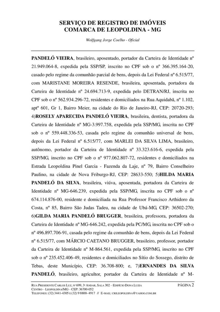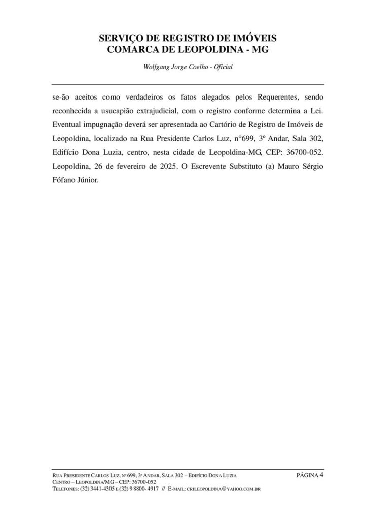 Mauro Sérgio Fófano Júnior, Escrevente Substituto do Cartório de Registro de Imóveis da Comarca de Leopoldina, Estado de Minas Gerais, na forma da lei, etc.