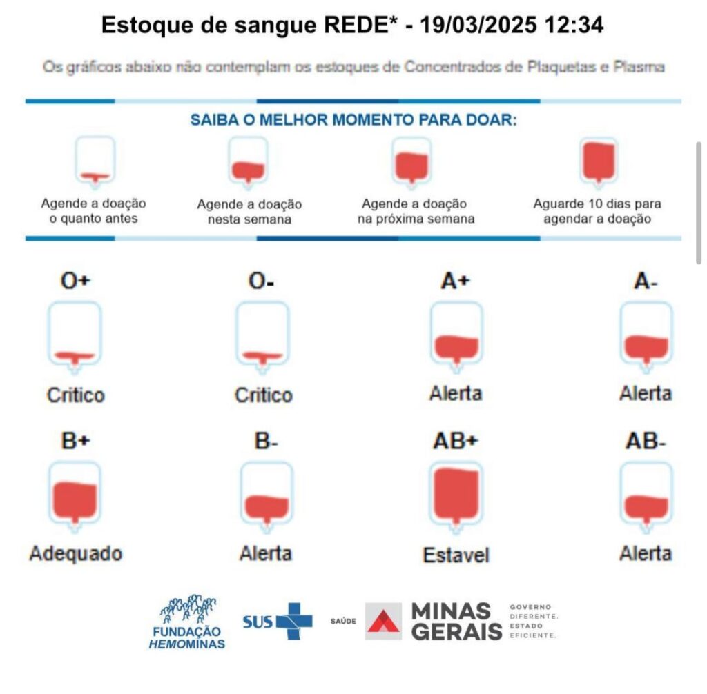 De acordo com a coordenadora do Polo de Saúde, Jéssica Montes, o estoque de sangue do tipo O+ e O- são os que estão no nível mais crítico. Veja todos os tipos sanguíneos que estão em falta:
