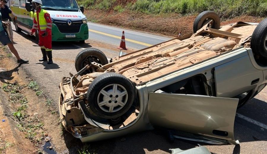 Carro com quatro adultos e uma criança capota na BR-116 em Muriaé
