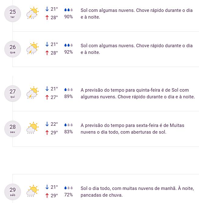 Ainda de acordo com o Inmet, a temperatura mínima fica em torno de 15°C na Zona da Mata e 14°C no Campo das Vertentes. As máximas variam entre 31°C e 27°C até sexta-feira (28).