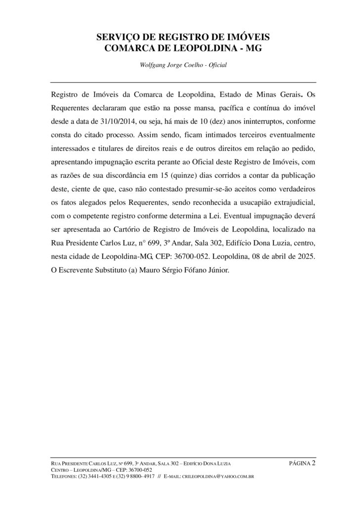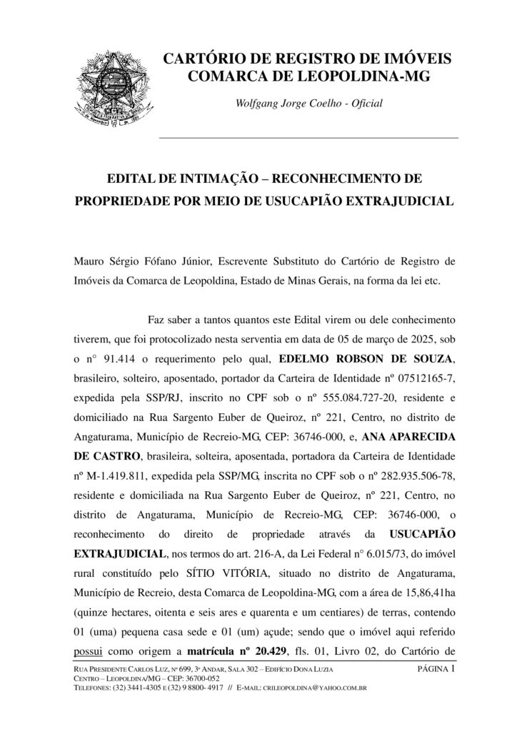 Faz saber a tantos quantos este Edital virem ou dele conhecimento tiverem, que foi protocolizado nesta serventia em data de 05 de março de 2025, sob o n° 91.414 o requerimento pelo qual, EDELMO ROBSON DE SOUZA, brasileiro, solteiro, aposentado, portador da Carteira de Identidade nº 07512165-7, expedida pela SSP/RJ, inscrito no CPF sob o nº 555.084.727-20, residente e domiciliado na Rua Sargento Euber de Queiroz, nº 221, Centro, no distrito de Angaturama, Município de Recreio-MG, CEP: 36746-000, e, ANA APARECIDA DE CASTRO, brasileira, solteira, aposentada, portadora da Carteira de Identidade nº M-1.419.811, expedida pela SSP/MG, inscrita no CPF sob o nº 282.935.506-78, residente e domiciliada na Rua Sargento Euber de Queiroz, nº 221, Centro, no distrito de Angaturama, Município de Recreio-MG, CEP: 36746-000, o reconhecimento do direito de propriedade através da USUCAPIÃO EXTRAJUDICIAL, nos termos do art. 216-A, da Lei Federal n° 6.015/73, do imóvel rural constituído pelo SÍTIO VITÓRIA, situado no distrito de Angaturama, Município de Recreio, desta Comarca de Leopoldina-MG, com a área de 15,86,41ha (quinze hectares, oitenta e seis ares e quarenta e um centiares) de terras, contendo 01 (uma) pequena casa sede e 01 (um) açude; sendo que o imóvel aqui referido possui como origem a matrícula nº 20.429, fls. 01, Livro 02, do Cartório de Registro de Imóveis da Comarca de Leopoldina, Estado de Minas Gerais. Os Requerentes declararam que estão na posse mansa, pacífica e contínua do imóvel desde a data de 31/10/2014, ou seja, há mais de 10 (dez) anos ininterruptos, conforme consta do citado processo. Assim sendo, ficam intimados terceiros eventualmente interessados e titulares de direitos reais e de outros direitos em relação ao pedido, apresentando impugnação escrita perante ao Oficial deste Registro de Imóveis, com as razões de sua discordância em 15 (quinze) dias corridos a contar da publicação deste, ciente de que, caso não contestado presumir-se-ão aceitos como verdadeiros os fatos alegados pelos Requerentes, sendo reconhecida a usucapião extrajudicial, com o competente registro conforme determina a Lei. Eventual impugnação deverá ser apresentada ao Cartório de Registro de Imóveis de Leopoldina, localizado na Rua Presidente Carlos Luz, n° 699, 3º Andar, Sala 302, Edifício Dona Luzia, centro, nesta cidade de Leopoldina-MG, CEP: 36700-052. Leopoldina, 08 de abril de 2025. O Escrevente Substituto (a) Mauro Sérgio Fófano Júnior.