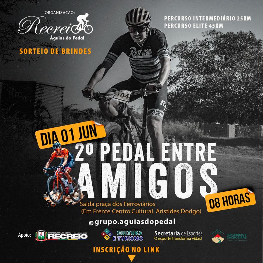 Será realizado em Recreio pela equipe Águias do Pedal, no dia 1º de junho, o Pedal do ABC Recreense (2º Pedal entre amigos), com apoio da Prefeitura Municipal através das Secretarias Municipais de Esportes e de Cultura e Turismo.