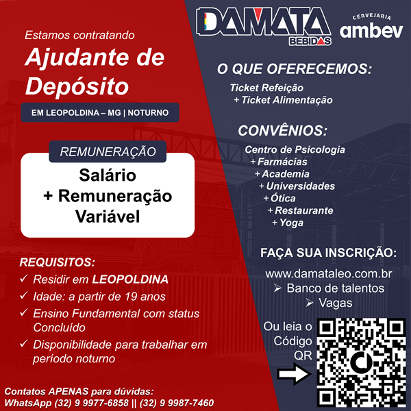 A DAMATA Bebidas divulgou nesta terça-feira, 15 de abril, a abertura de processo seletivo para contratar ajudante de depósito para o município de Leopoldina.