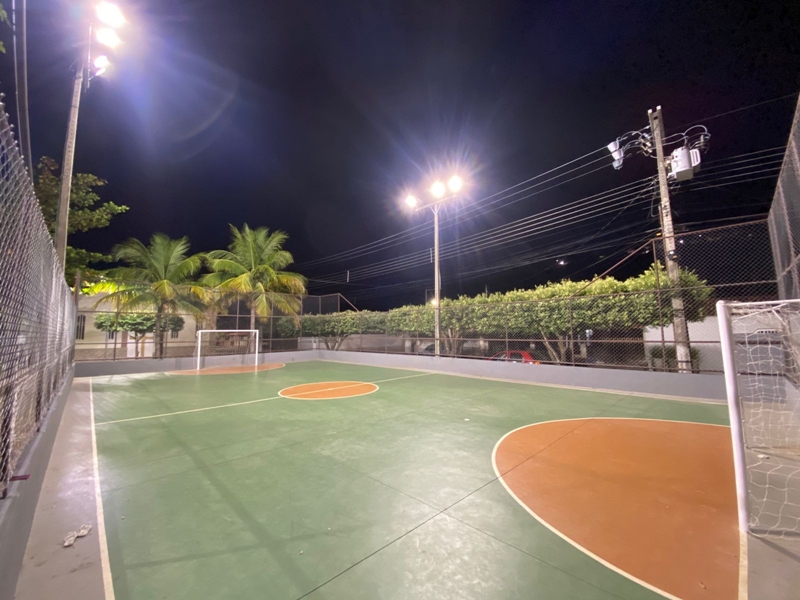 A quadra poliesportiva também foi completamente reformada, recebendo novo piso, alambrado, pintura e traves, garantindo melhores condições para a prática esportiva e beneficiando diretamente os jovens e atletas da comunidade.