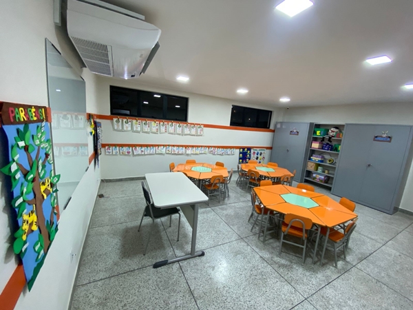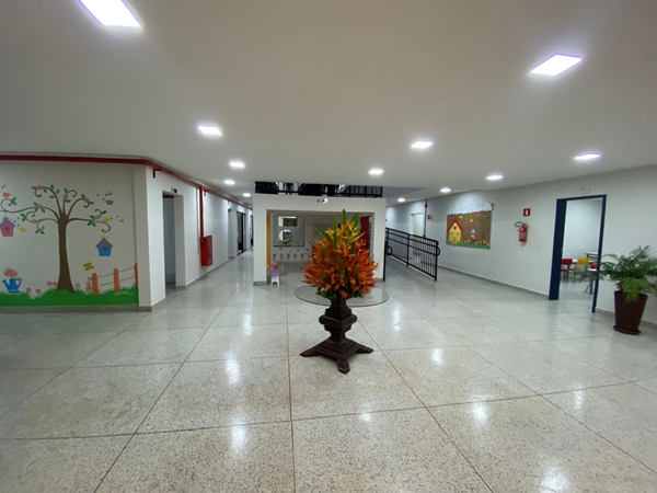 Com 1.158 m² de área construída, a nova creche conta com dois pavimentos e uma estrutura pensada nos mínimos detalhes: oito salas de aula com banheiros, brinquedoteca, berçário, refeitório e cozinha, sala de professores e sala multiuso, pátio coberto, área gramada e espaço para horta escolar.