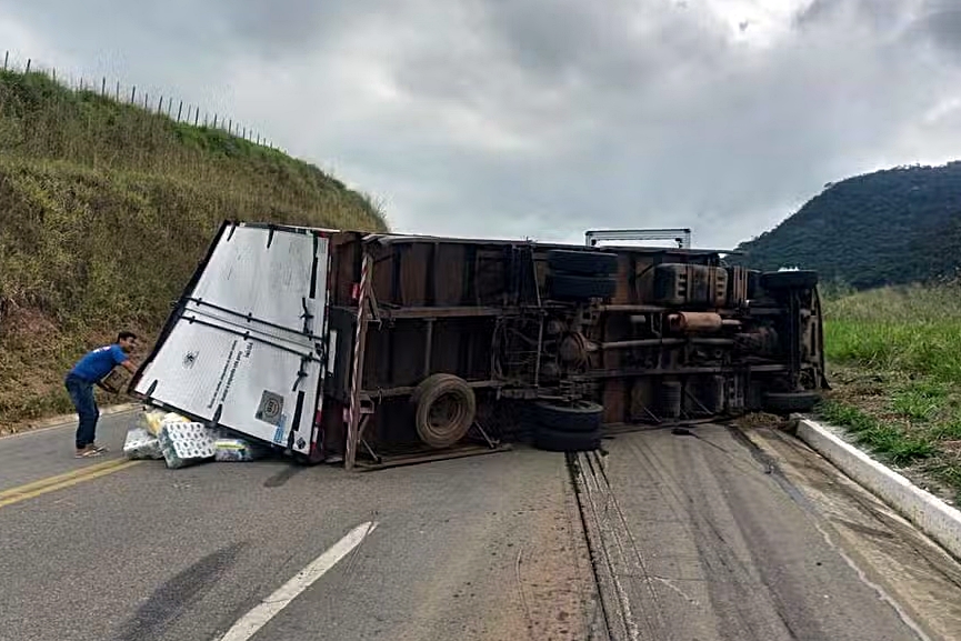 Veículo perdeu o freio na Serra de Pirapanema e tombou na pista. Ninguém ficou ferido.
