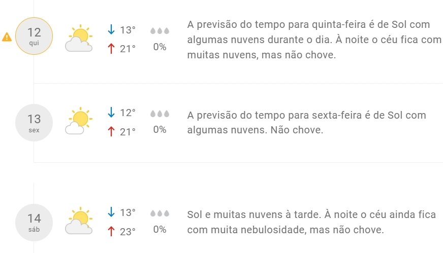 Conforme a previsão, a quinta será de sol com algumas nuvens durante o dia. À noite, o céu fica com muitas nuvens, mas não chove.