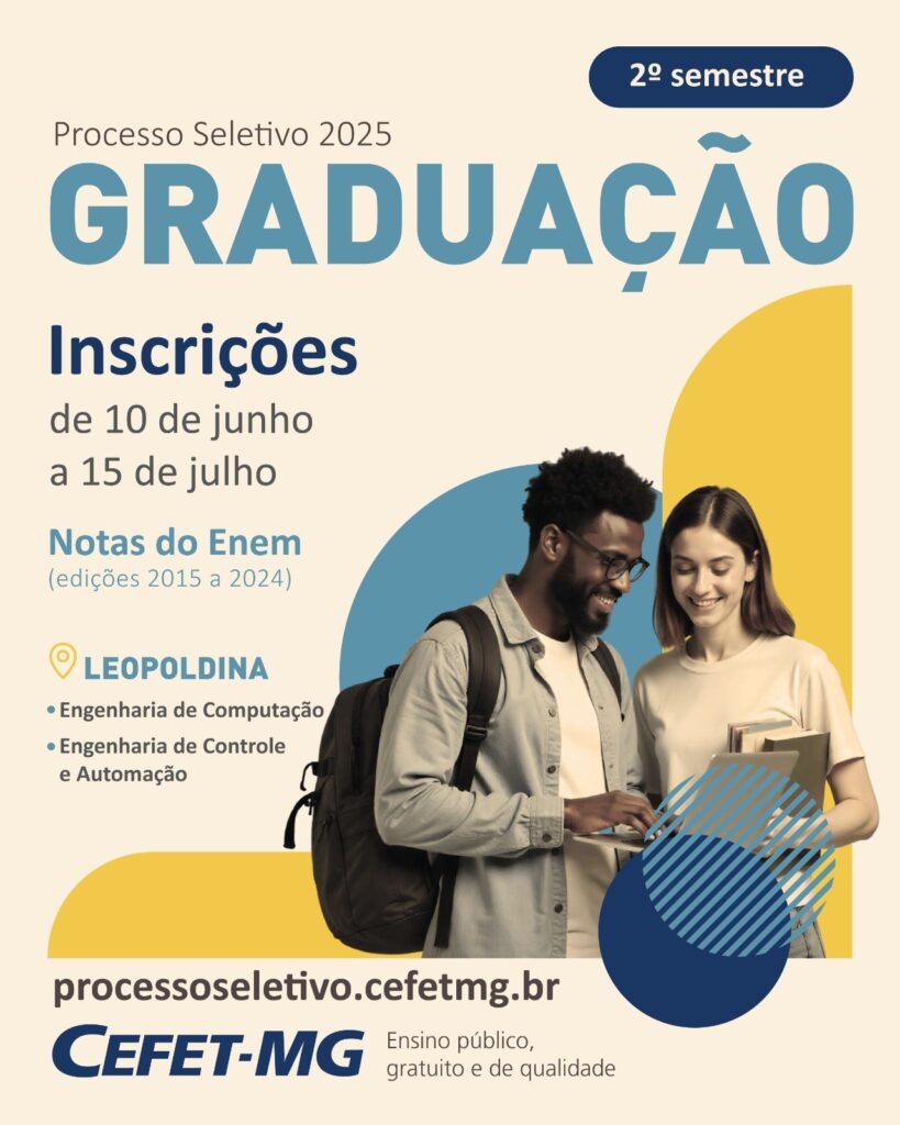 O CEFET-MG também recebe inscrições, até o dia 23 de junho, para o processo seletivo de vagas remanescentes da graduação. As vagas são ofertadas nas modalidades reopção de curso, reingresso, transferência e obtenção de novo título.