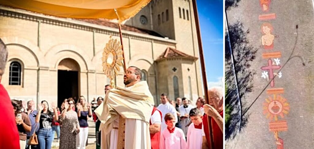 Fiéis católicos celebraram nesta quinta-feira, 19 de junho, o Dia de Corpus Christi. Uma das tradições mais populares da data é a confecção de tapetes coloridos, com materiais como serragem.