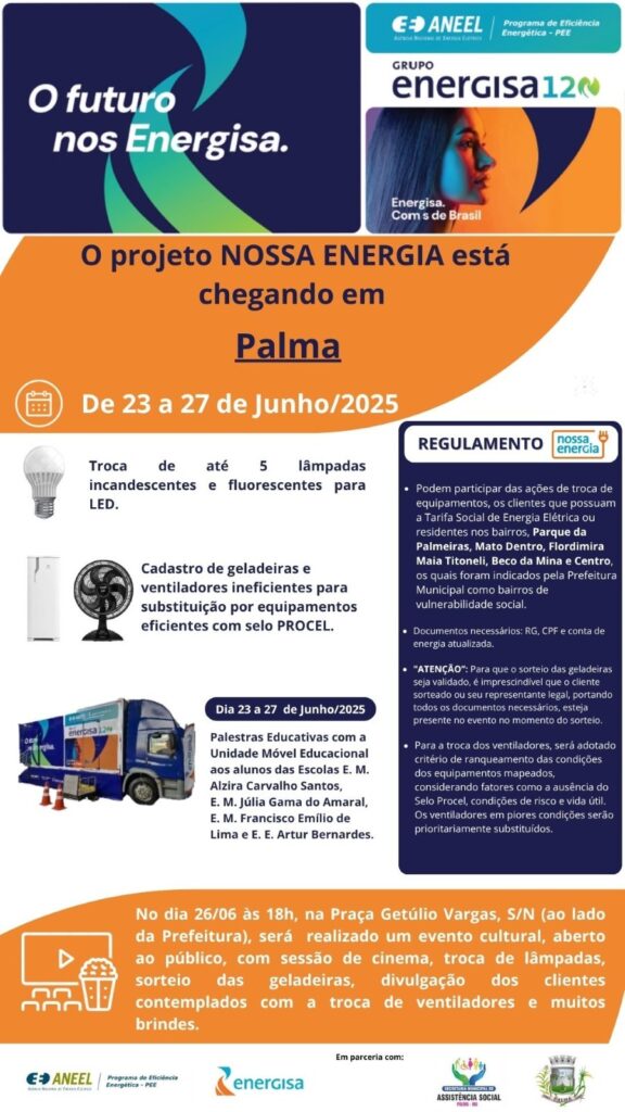E não para por aí! Na quinta-feira, 26/06, a Energisa promove um evento cultural, aberto ao público, com sessão de cinema, sorteio de geladeiras, brindes, e divulgação dos clientes contemplados com a troca de ventiladores. O evento será às 18h, na Praça Getúlio Vargas, S/N (ao lado da Prefeitura) – Centro, onde ficará estacionado a Unidade Móvel do Nossa Energia.