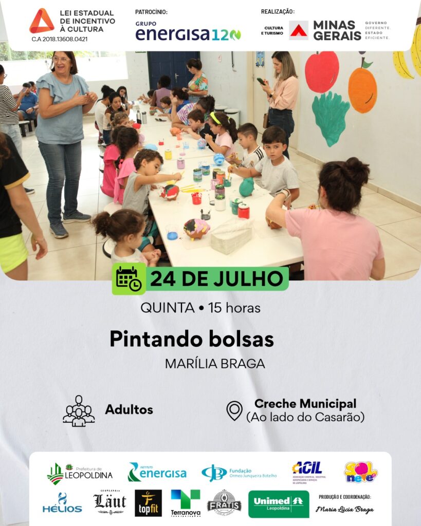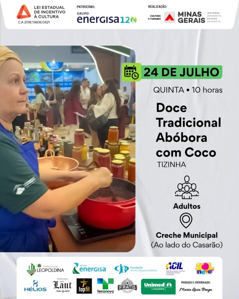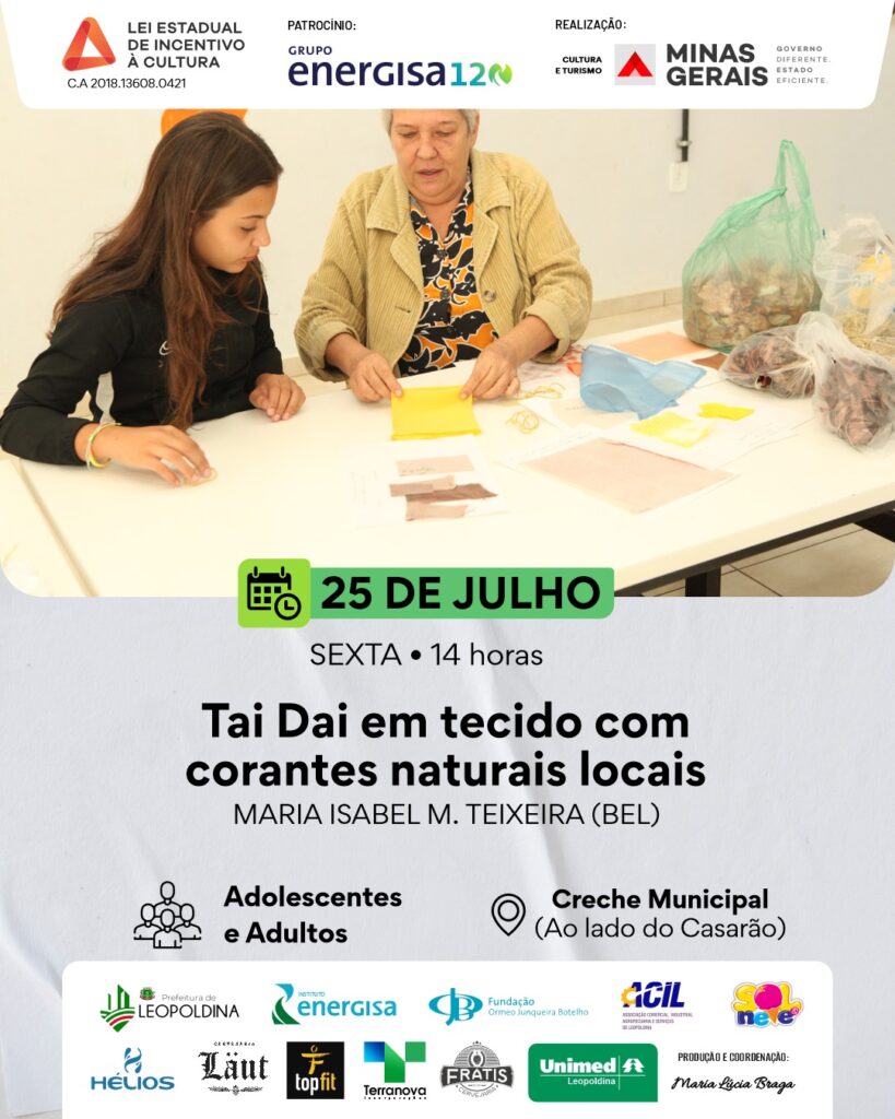 Na quinta-feira (24/07), a programação começa às 10h com a oficina de Doce Tradicional de Abóbora com Coco, com Tizinha. À tarde, a artista Marília Braga comanda duas oficinas de pintura — às 14h, para crianças, e às 15h, para adultos. Também às 14h, Maria Isabel (Bel) oferece uma oficina de Tie-Dye com corantes naturais, voltada a adolescentes e adultos.
