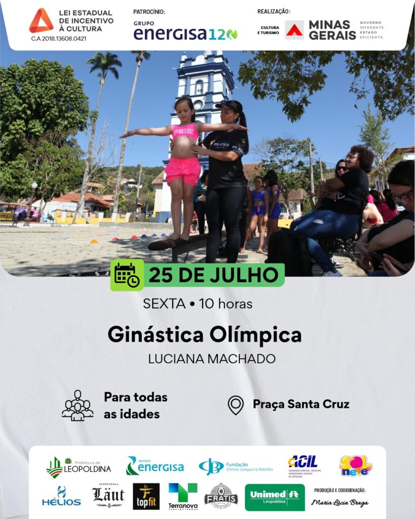 Na sexta-feira (25/07), às 10h, a professora Luciana Machado ministra a oficina de Ginástica Olímpica, aberta a todas as idades, na Praça Santa Cruz.