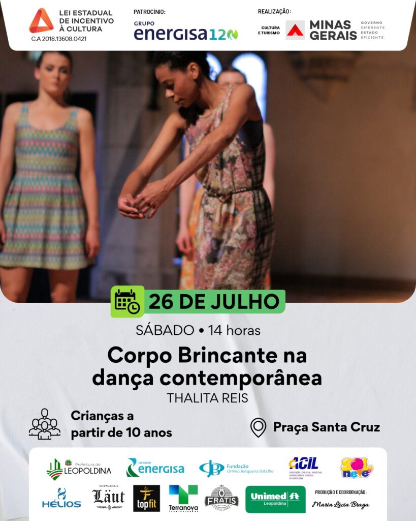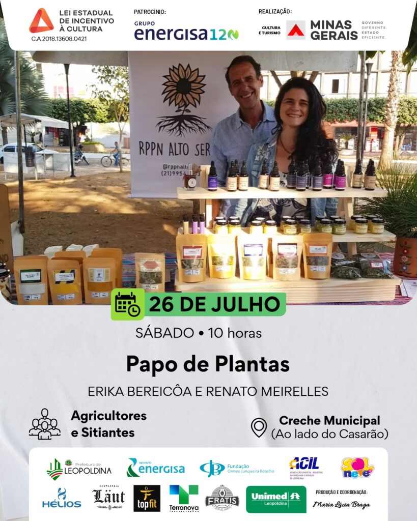 No sábado (26/07), às 10h, o casal Erika Bereicôa e Renato Meirelles conduz a roda de conversa ‘Papo de Plantas’, voltada para agricultores e sitiantes. Às 14h, a professora Thalita Reis encerra a programação com a oficina ‘Corpo Brincante na Dança Contemporânea’, para crianças a partir de 10 anos.