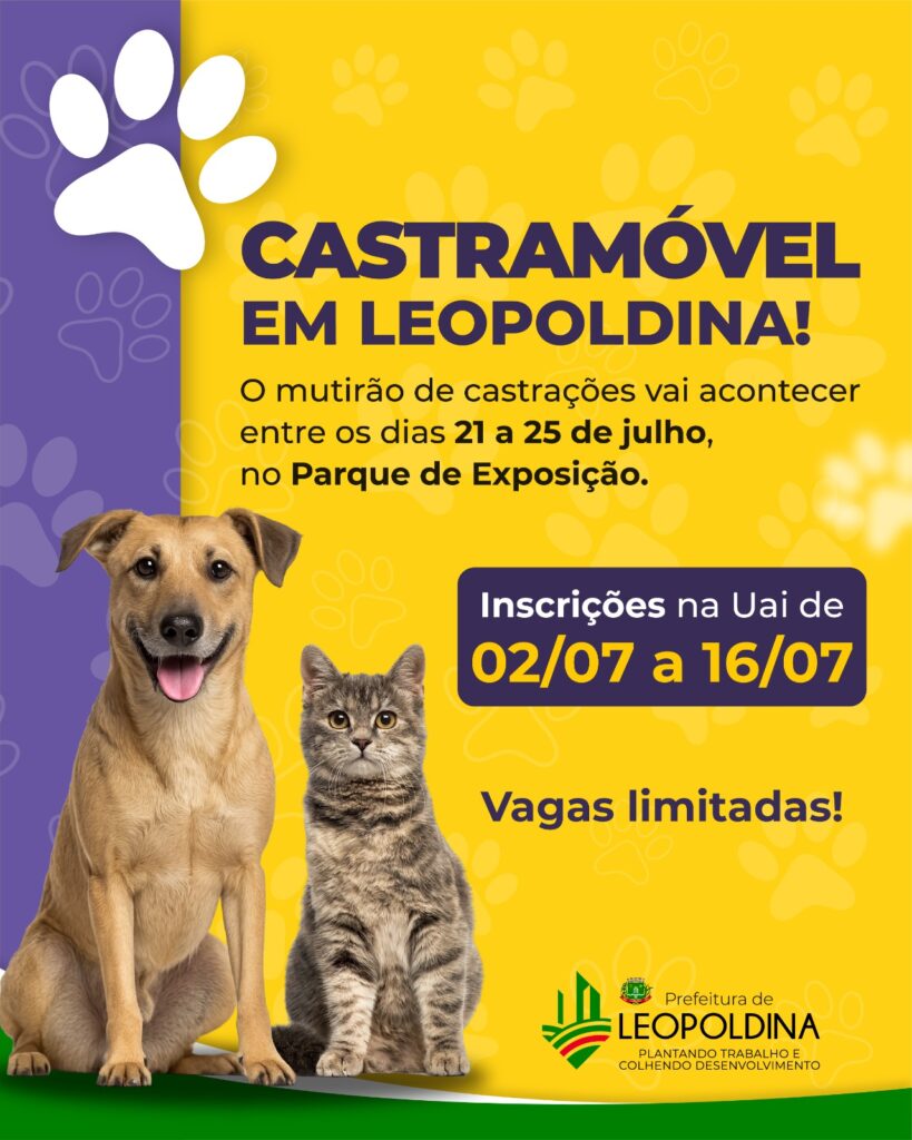 De 21 a 25 de julho, a Prefeitura de Leopoldina realizará um grande mutirão de castrações gratuitas no Parque de Exposições José Ribeiro dos Reis.