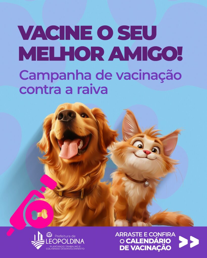 “Vacine o seu melhor amigo!” Com esse chamado, a Prefeitura de Leopoldina, por meio da Secretaria Municipal de Saúde e do Setor de Endemias, inicia no próximo dia 4 de agosto a Campanha de Vacinação Antirrábica 2025, com o objetivo de imunizar cães e gatos em todo o município, incluindo bairros urbanos e distritos.