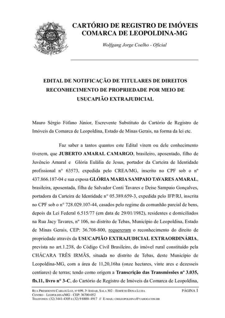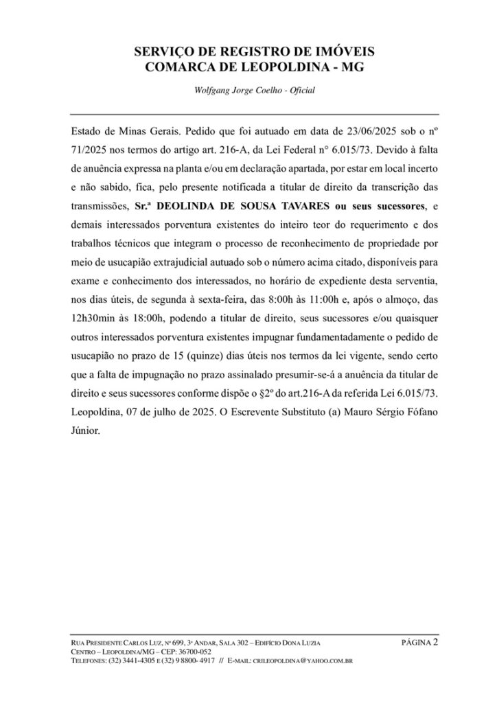 Faz saber a tantos quantos este Edital virem ou dele conhecimento tiverem, que JUBERTO AMARAL CAMARGO, brasileiro, aposentado, filho de Juvêncio Amaral e Glória Eulália de Jesus, portador da Carteira de Identidade profissional n° 63573, expedida pelo CREA/MG, inscrito no CPF sob o nº 437.866.187-04 e sua esposa GLÓRIA MARIA SAMPAIO TAVARES AMARAL, brasileira, aposentada, filha de Salvador Conti Tavares e Deise Sampaio Gonçalves, portadora da Carteira de Identidade n° 05.389.659-3, expedida pelo IFP/RJ, inscrita no CPF sob o n° 728.029.107-44, casados pelo regime da comunhão parcial de bens, depois da Lei Federal 6.515/77 (em data de 29/01/1982), residentes e domiciliados na Rua Jacy Tavares, nº 106, no distrito de Tebas, Município de Leopoldina, Estado de Minas Gerais, CEP: 36.708-800, requereram o reconhecimento do direito de propriedade através da USUCAPIÃO EXTRAJUDICIAL EXTRAORDINÁRIA, prevista no art.1.238, do Código Civil Brasileiro, do imóvel rural constituído pela CHÁCARA TRÊS IRMÃS, situada no distrito de Tebas, deste Município de Leopoldina-MG, com a área de 11,20,16ha (onze hectares, vinte ares e dezesseis centiares) de terras; tendo como origem a Transcrição das Transmissões nº 3.035, fls.11, livro n° 3-C, do Cartório de Registro de Imóveis da Comarca de Leopoldina, Estado de Minas Gerais. Pedido que foi autuado em data de 23/06/2025 sob o nº 71/2025 nos termos do artigo art. 216-A, da Lei Federal n° 6.015/73. Devido à falta de anuência expressa na planta e/ou em declaração apartada, por estar em local incerto e não sabido, fica, pelo presente notificada a titular de direito da transcrição das transmissões, Sr.ª DEOLINDA DE SOUSA TAVARES ou seus sucessores, e demais interessados porventura existentes do inteiro teor do requerimento e dos trabalhos técnicos que integram o processo de reconhecimento de propriedade por meio de usucapião extrajudicial autuado sob o número acima citado, disponíveis para exame e conhecimento dos interessados, no horário de expediente desta serventia, nos dias úteis, de segunda à sexta-feira, das 8:00h às 11:00h e, após o almoço, das 12h30min às 18:00h, podendo a titular de direito, seus sucessores e/ou quaisquer outros interessados porventura existentes impugnar fundamentadamente o pedido de usucapião no prazo de 15 (quinze) dias úteis nos termos da lei vigente, sendo certo que a falta de impugnação no prazo assinalado presumir-se-á a anuência da titular de direito e seus sucessores conforme dispõe o §2º do art.216-A da referida Lei 6.015/73. Leopoldina, 07 de julho de 2025. O Escrevente Substituto (a) Mauro Sérgio Fófano Júnior.