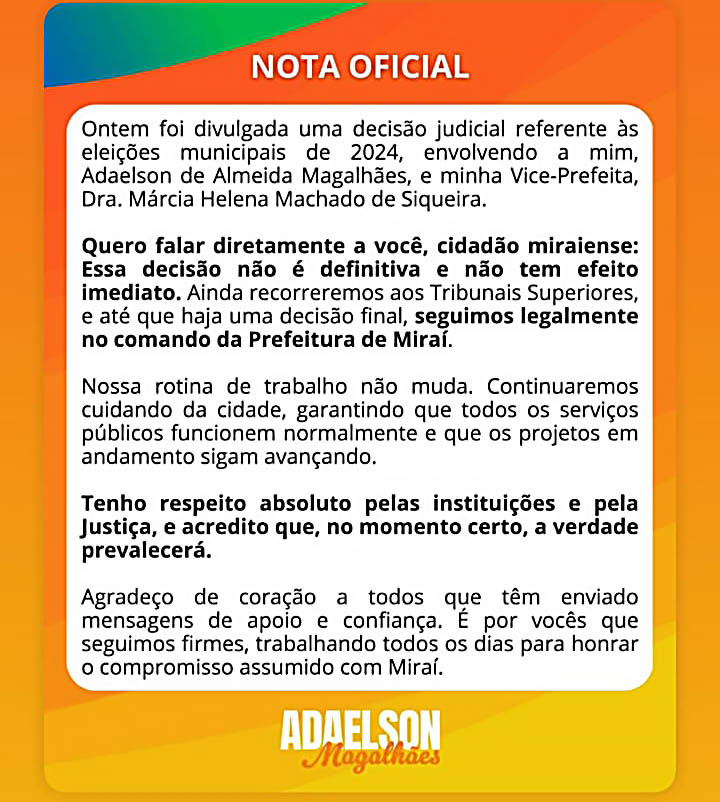 O prefeito Adaelson Magalhães divulgou uma Nota Oficial sobre a decisão de Primeira Instância que cassou seu mandato. No texto (veja na íntegra abaixo) ele diz que vai recorrer da decisão nas “instâncias superiores” e que “a decisão não é definitiva e não tem efeito imediato.” E acrescentou: “Nossa rotina de trabalho não muda.” Também reiterou seu respeito à justiça e disse acreditar que “no momento certo a verdade prevalecerá.”