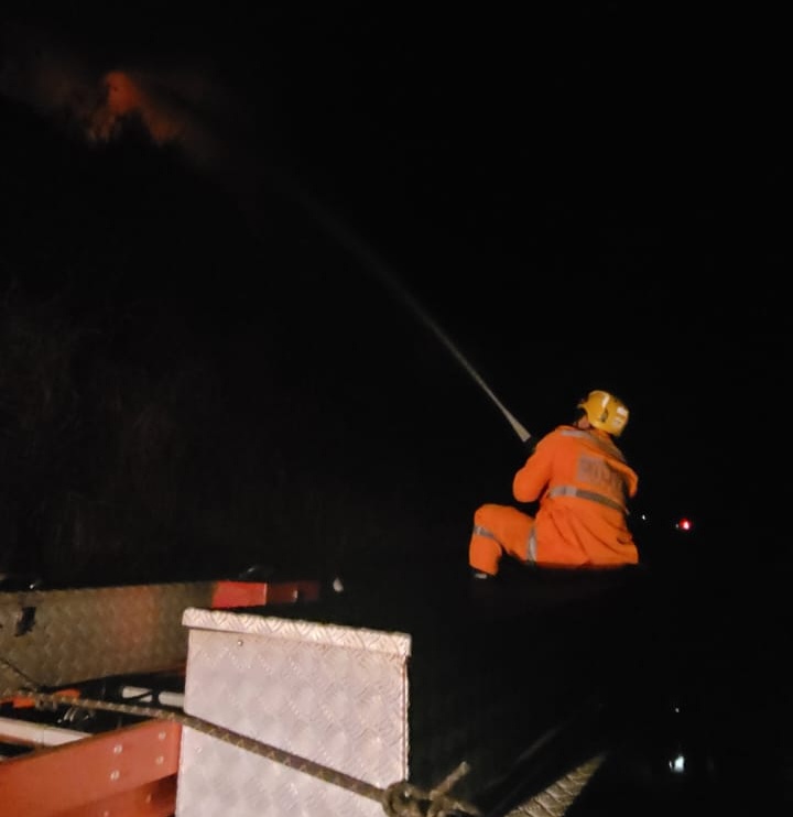 No local, 7 pessoas não identificadas inicialmente tentaram debelar o incêndio, mas não obtiveram sucesso. O Corpo de Bombeiros foi acionado e realizou ações de sinalização na rodovia, alertando os condutores sobre a presença do incêndio e a necessidade de reduzir a velocidade.
