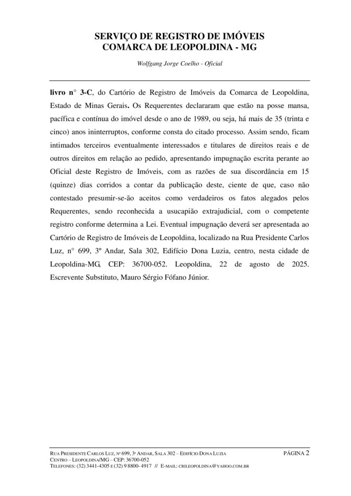 Faz saber a tantos quantos este Edital virem ou dele conhecimento tiverem, que foi protocolizado nesta serventia em data de 23 de junho de 2025, sob o n° 91.950 o requerimento pelo qual, JUBERTO AMARAL CAMARGO, brasileiro, aposentado, filho de Juvêncio Amaral e Glória Eulália de Jesus, portador da Carteira de Identidade profissional n° 63573, expedida pelo CREA/MG, inscrito no CPF sob o nº 437.866.187-04 e sua esposa GLÓRIA MARIA SAMPAIO TAVARES AMARAL, brasileira, aposentada, filha de Salvador Conti Tavares e Deise Sampaio Gonçalves, portadora da Carteira de Identidade n° 05.389.659-3, expedida pelo IFP/RJ, inscrita no CPF sob o n° 728.029.107-44, casados pelo regime da comunhão parcial de bens, depois da Lei Federal 6.515/77 (em data de 29/01/1982), residentes e domiciliados na Rua Jacy Tavares, nº106, no distrito de Tebas, Município de Leopoldina, Estado de Minas Gerais, CEP: 36.708-800, o reconhecimento do direito de propriedade através da USUCAPIÃO EXTRAJUDICIAL, nos termos do art. 216-A, da Lei Federal n° 6.015/73, do imóvel rural constituído pela CHÁCARA TRÊS IRMÃS, situada no distrito de Tebas, deste Município de Leopoldina-MG, com a área de 11,20,16ha (onze hectares, vinte ares e dezesseis centiares) de terras; sendo que o imóvel aqui referido possui como origem a Transcrição das Transmissões nº 3.035, fls.11, livro n° 3-C, do Cartório de Registro de Imóveis da Comarca de Leopoldina, Estado de Minas Gerais. Os Requerentes declararam que estão na posse mansa, pacífica e contínua do imóvel desde o ano de 1989, ou seja, há mais de 35 (trinta e cinco) anos ininterruptos, conforme consta do citado processo.Assim sendo, ficam intimados terceiros eventualmente interessados e titulares de direitos reais e de outros direitos em relação ao pedido, apresentando impugnação escrita perante ao Oficial deste Registro de Imóveis, com as razões de sua discordância em 15 (quinze) dias corridos a contar da publicação deste, ciente de que, caso não contestado presumir-se-ão aceitos como verdadeiros os fatos alegados pelos Requerentes, sendo reconhecida a usucapião extrajudicial, com o competente registro conforme determina a Lei. Eventual impugnação deverá ser apresentada ao Cartório de Registro de Imóveis de Leopoldina, localizado na Rua Presidente Carlos Luz, n° 699, 3º Andar, Sala 302, Edifício Dona Luzia, centro, nesta cidade de Leopoldina-MG, CEP: 36700-052. Leopoldina, 22 de agosto de 2025.
