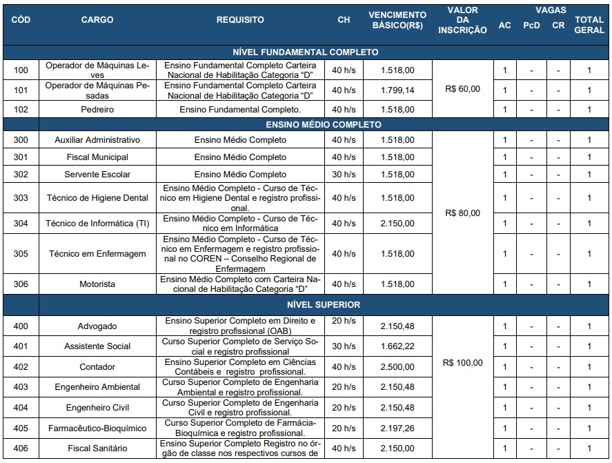 A taxa de inscrição será de R$ 60 para cargos de nível fundamental, R$ 80 para médio e técnico e de R$ 100 para os cargos de nível superior.
