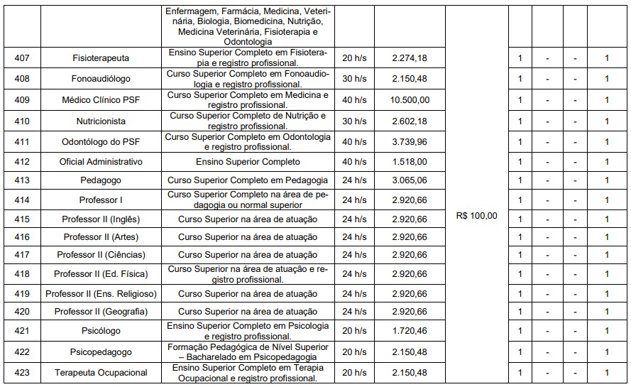Os salários variam conforme o cargo e jornada de trabalho, entre R$ 1.518 e R$ 10.500. Há vagas para interessados com formação de nível fundamental, médio, técnico e superior.