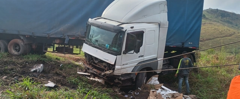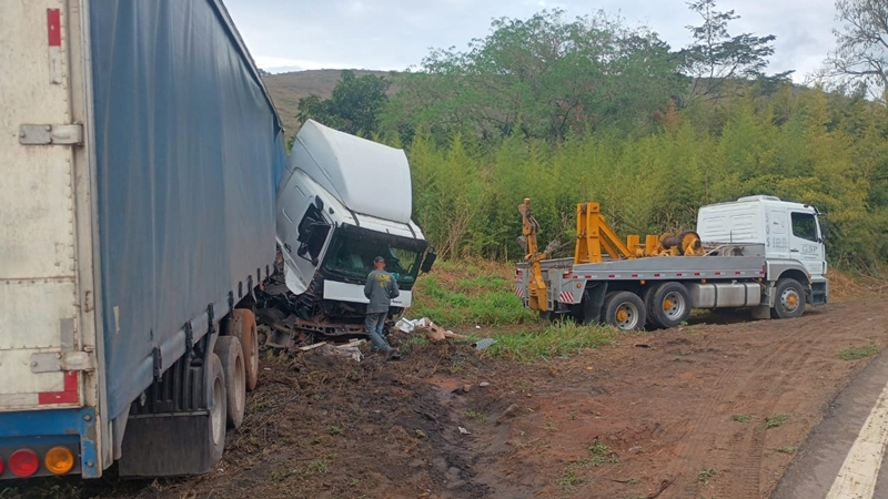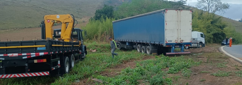 Uma carreta deu “L” e saiu da pista na rodovia BR-116, em Leopoldina, na altura do km 776 da rodovia. O acidente aconteceu no final da noite desta segunda-feira, 22 de setembro, próximo à Serra da Vileta.
