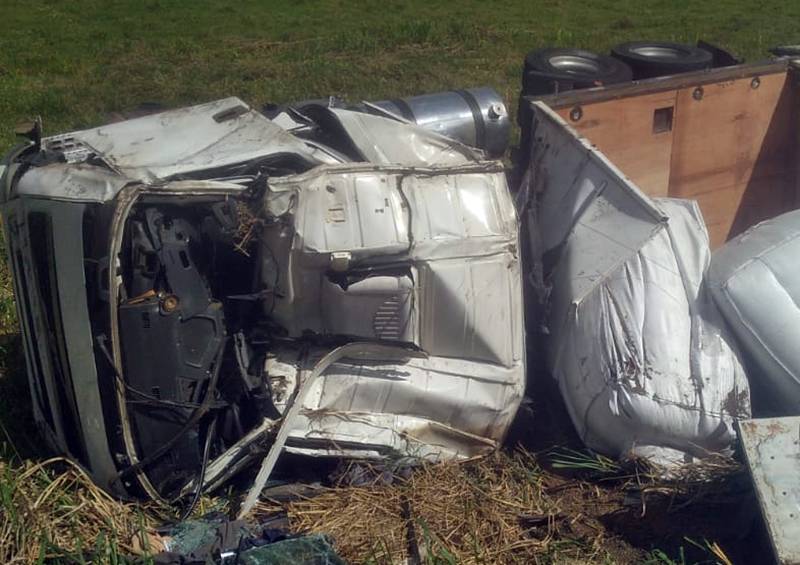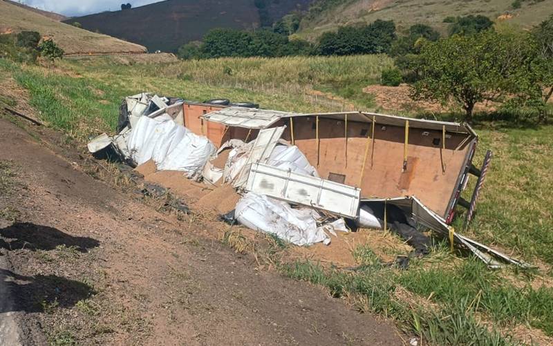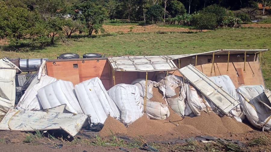 Uma carreta carregada com café tombou na BR-116, em Leopoldina, neste sábado, 27 de setembro. O acidente foi registrado no km 777 da rodovia.