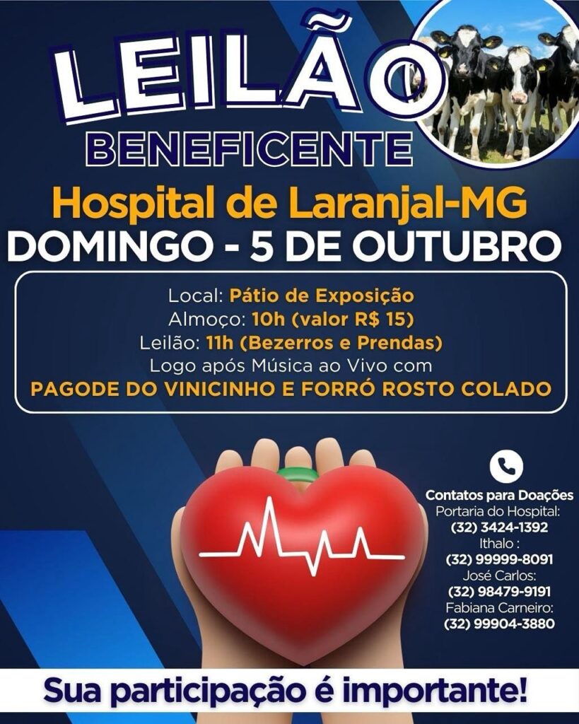 O Hospital Comunitário de Laranjal promove no próximo domingo, 5 de outubro, um leilão beneficente com o objetivo de arrecadar recursos para a instituição. O evento será realizado no Pátio de Exposição do município.