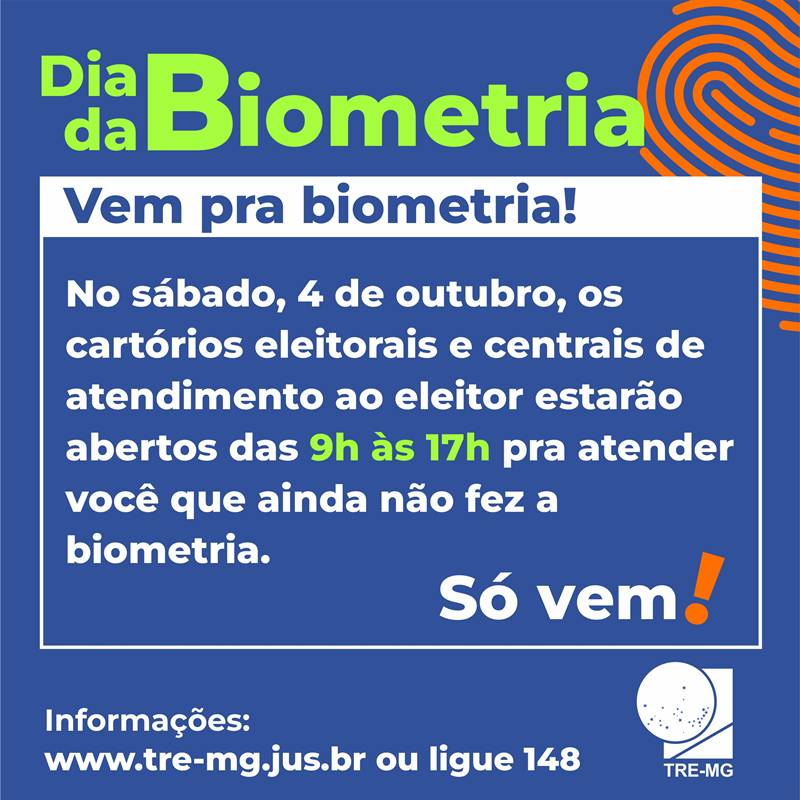 A Justiça Eleitoral de Minas Gerais realiza neste sábado, 4 de outubro, o “Dia da Biometria”, uma ação especial para atender eleitoras e eleitores que ainda não fizeram o cadastro biométrico. Os cartórios eleitorais e as centrais de atendimento ao eleitor em todo o estado funcionarão em horário ampliado, das 9h às 17h.