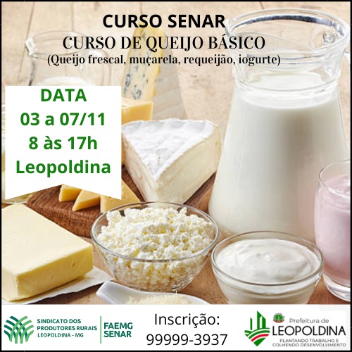 Entre os dias 3 e 7 de novembro, das 8h às 17h, será realizado em Leopoldina o Curso de Queijo Básico do SENAR, uma capacitação gratuita que vai ensinar a produção de queijo frescal, muçarela, requeijão e iogurte.