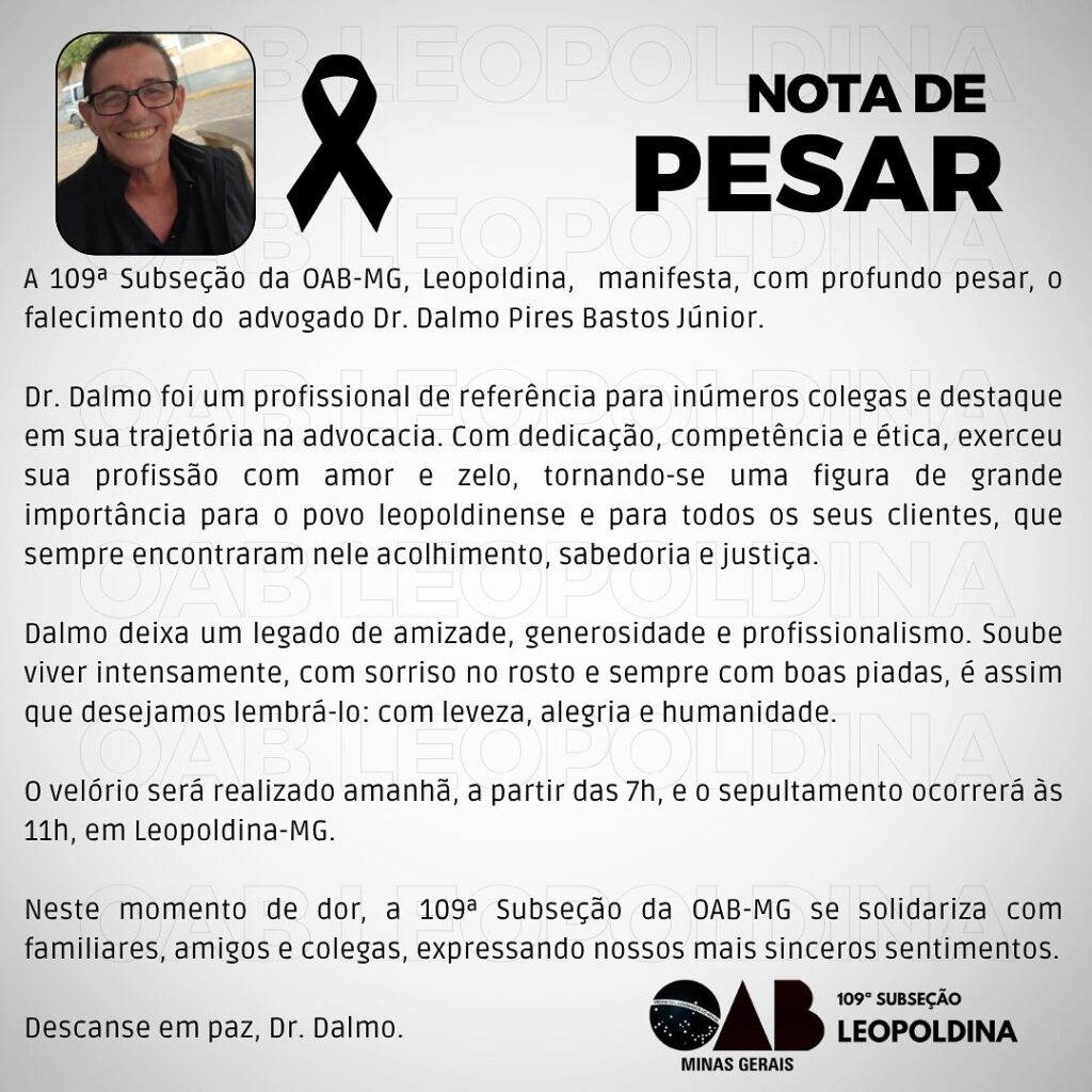 A 109ª Subseção da OAB-MG em Leopoldina também lamentou o falecimento de Dalminho e solidarizou-se com familiares, amigos e colegas: