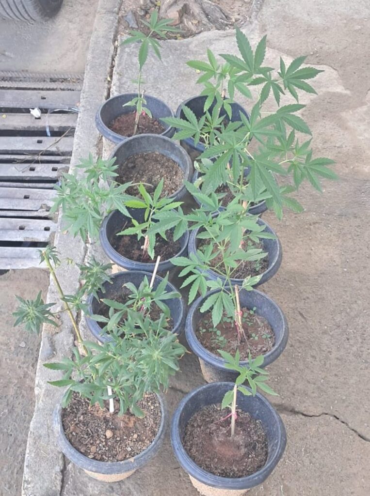Durante a averiguação, foram encontrados 10 pés de maconha no quintal. O autor recebeu voz de prisão e teve seus direitos assegurados. Ele foi encaminhado para a delegacia, onde o caso será investigado.