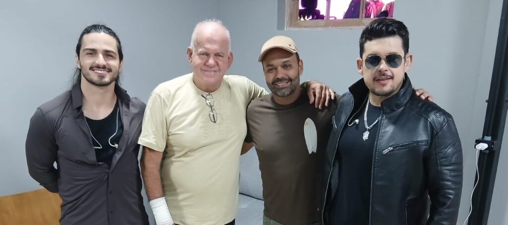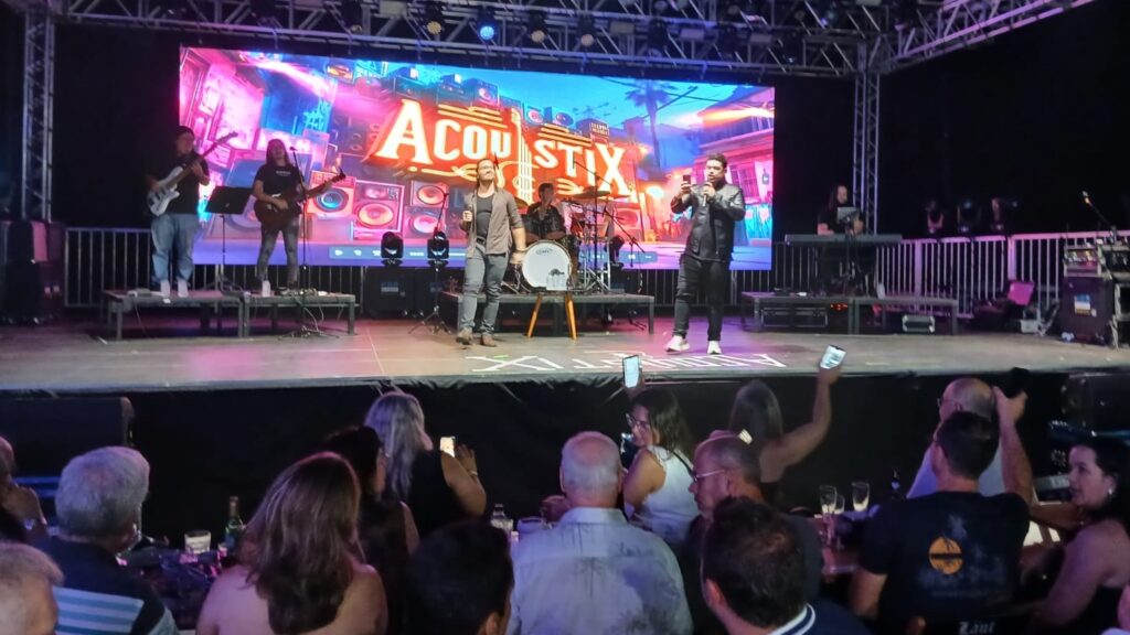 Antes do show, Edu e Bruno, vocalistas do Acoustix, recebem no camarim o anfitrião Ricardo Barros Mendes e a Coluna.