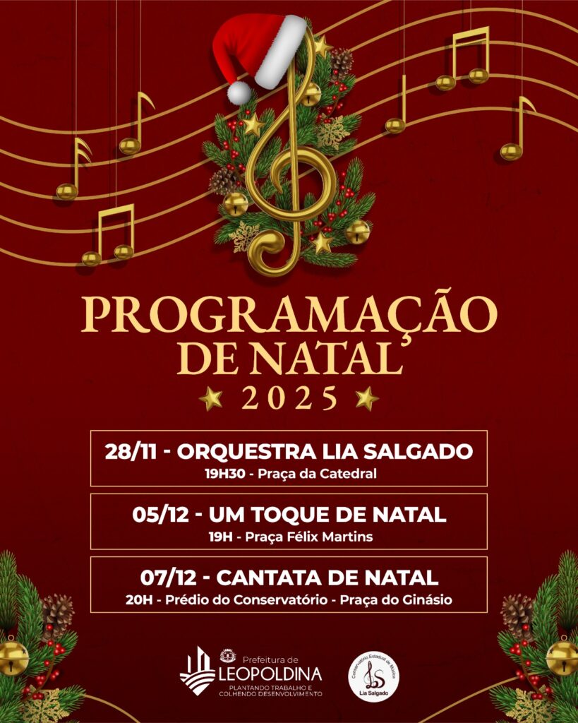 A programação completa da cidade traz outras atrações musicais ao longo da semana, incluindo a apresentação da Orquestra Lia Salgado no dia 28 de novembro, na Praça da Catedral, e o evento “Um Toque de Natal”, no dia 5 de dezembro, na Praça Félix Martins.