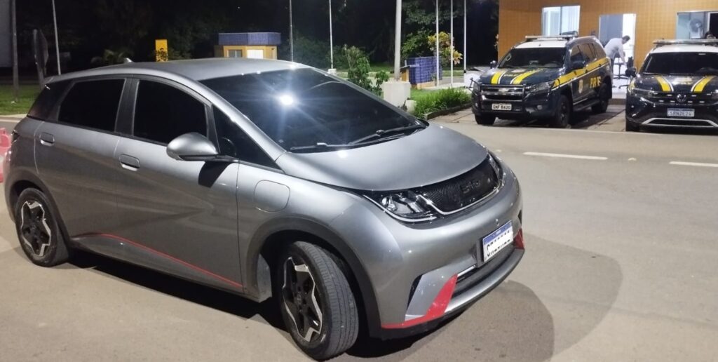 O veículo, um BYD Dolphin, possuía registro de roubo na cidade do Rio de Janeiro, ocorrido em 6 de setembro deste ano. Durante a abordagem, os policiais identificaram indícios de adulteração nas placas, o que motivou uma vistoria mais detalhada.