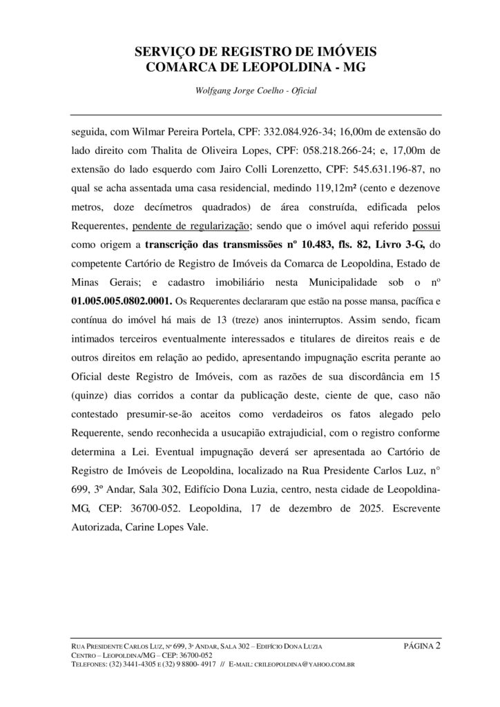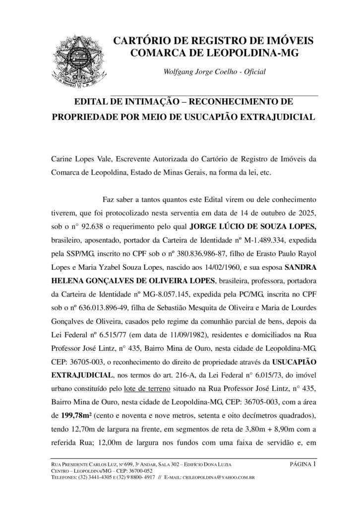 Faz saber a tantos quantos este Edital virem ou dele conhecimento tiverem, que foi protocolizado nesta serventia em data de 14 de outubro de 2025, sob o n° 92.638 o requerimento pelo qual JORGE LÚCIO DE SOUZA LOPES, brasileiro, aposentado, portador da Carteira de Identidade nº M-1.489.334, expedida pela SSP/MG, inscrito no CPF sob o nº 380.836.986-87, filho de Erasto Paulo Rayol Lopes e Maria Yzabel Souza Lopes, nascido aos 14/02/1960, e sua esposa SANDRA HELENA GONÇALVES DE OLIVEIRA LOPES, brasileira, professora, portadora da Carteira de Identidade nº MG-8.057.145, expedida pela PC/MG, inscrita no CPF sob o nº 636.013.896-49, filha de Sebastião Mesquita de Oliveira e Maria de Lourdes Gonçalves de Oliveira, casados pelo regime da comunhão parcial de bens, depois da Lei Federal nº 6.515/77 (em data de 11/09/1982), residentes e domiciliados na Rua Professor José Lintz, n° 435, Bairro Mina de Ouro, nesta cidade de Leopoldina-MG, CEP: 36705-003, o reconhecimento do direito de propriedade através da USUCAPIÃO EXTRAJUDICIAL, nos termos do art. 216-A, da Lei Federal n° 6.015/73, do imóvel urbano constituído pelo lote de terreno situado na Rua Professor José Lintz, n° 435, Bairro Mina de Ouro, nesta cidade de Leopoldina-MG, CEP: 36705-003, com a área de 199,78m² (cento e noventa e nove metros, setenta e oito decímetros quadrados), tendo 12,70m de largura na frente, em segmentos de reta de 3,80m + 8,90m com a referida Rua; 12,00m de largura nos fundos com uma faixa de servidão e, em seguida, com Wilmar Pereira Portela, CPF: 332.084.926-34; 16,00m de extensão do lado direito com Thalita de Oliveira Lopes, CPF: 058.218.266-24; e, 17,00m de extensão do lado esquerdo com Jairo Colli Lorenzetto, CPF: 545.631.196-87, no qual se acha assentada uma casa residencial, medindo 119,12m² (cento e dezenove metros, doze decímetros quadrados) de área construída, edificada pelos Requerentes, pendente de regularização; sendo que o imóvel aqui referido possui como origem a transcrição das transmissões nº 10.483, fls. 82, Livro 3-G, do competente Cartório de Registro de Imóveis da Comarca de Leopoldina, Estado de Minas Gerais; e cadastro imobiliário nesta Municipalidade sob o no 01.005.005.0802.0001. Os Requerentes declararam que estão na posse mansa, pacífica e contínua do imóvel há mais de 13 (treze) anos ininterruptos. Assim sendo, ficam intimados terceiros eventualmente interessados e titulares de direitos reais e de outros direitos em relação ao pedido, apresentando impugnação escrita perante ao Oficial deste Registro de Imóveis, com as razões de sua discordância em 15 (quinze) dias corridos a contar da publicação deste, ciente de que, caso não contestado presumir-se-ão aceitos como verdadeiros os fatos alegado pelo Requerente, sendo reconhecida a usucapião extrajudicial, com o registro conforme determina a Lei. Eventual impugnação deverá ser apresentada ao Cartório de Registro de Imóveis de Leopoldina, localizado na Rua Presidente Carlos Luz, n° 699, 3º Andar, Sala 302, Edifício Dona Luzia, centro, nesta cidade de Leopoldina-MG, CEP: 36700-052. Leopoldina, 17 de dezembro de 2025. Escrevente Autorizada, Carine Lopes Vale.