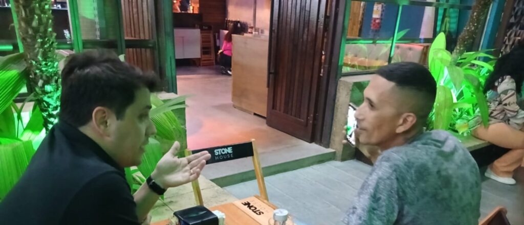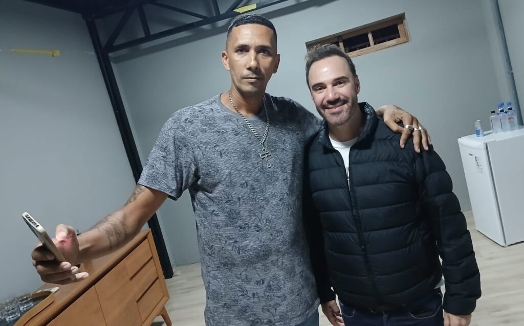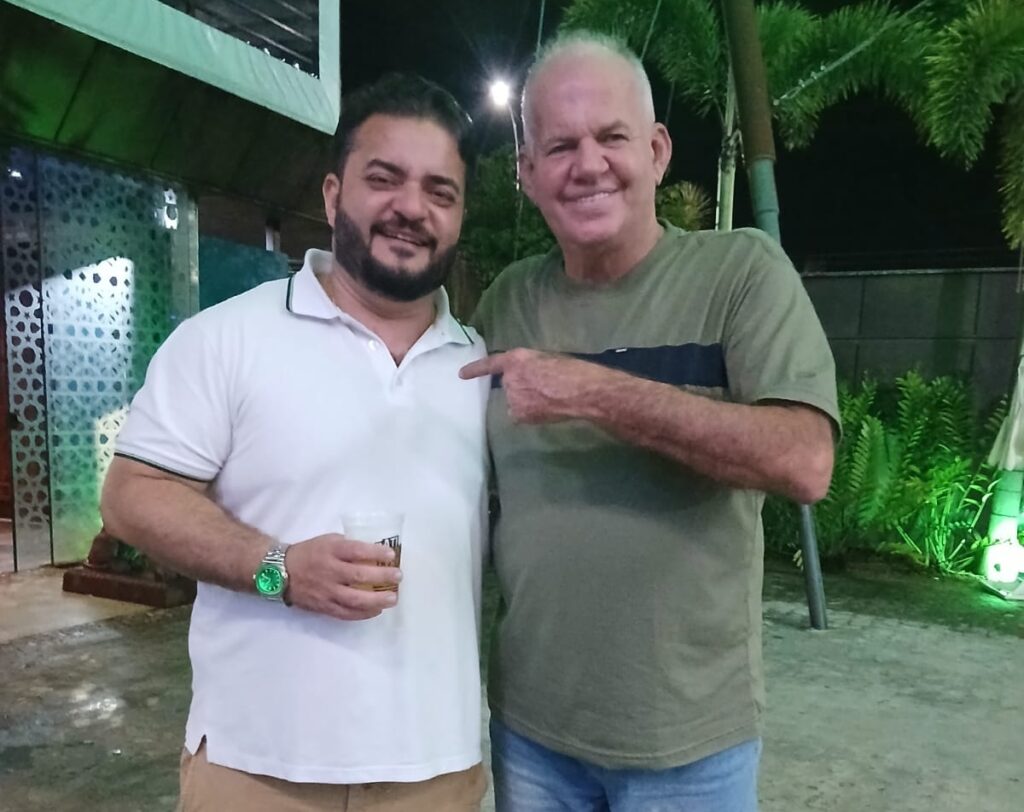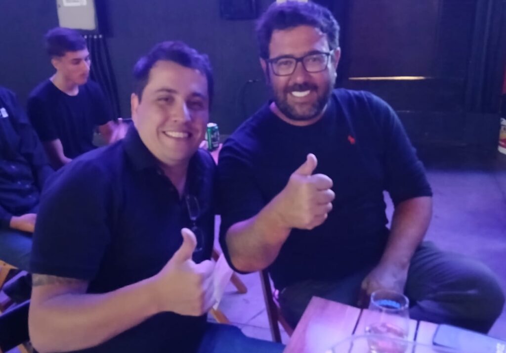 O médico e empresário Dr. Felipe Cabral (D) e seu primo, Vereador José Augusto Cabral, minutos antes do início do stand up de Diogo Portugal.