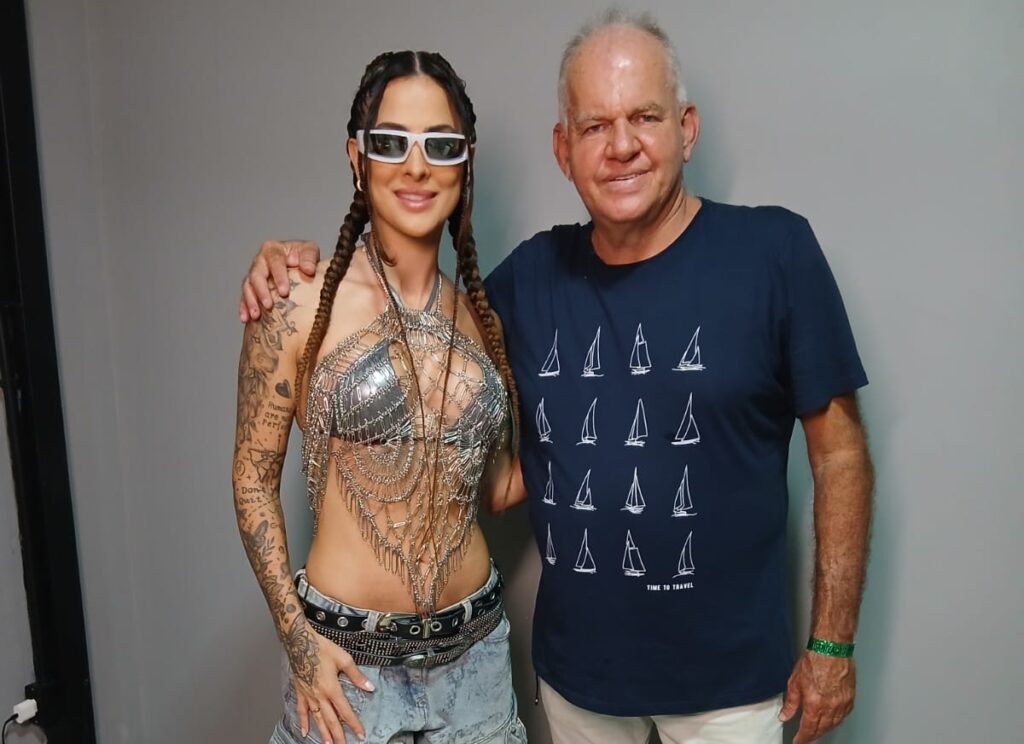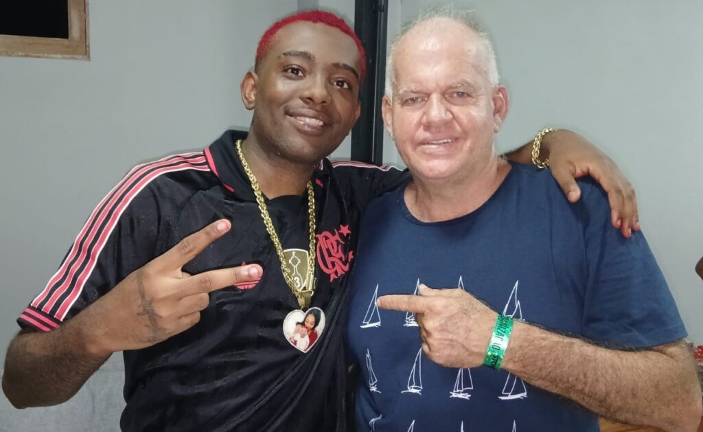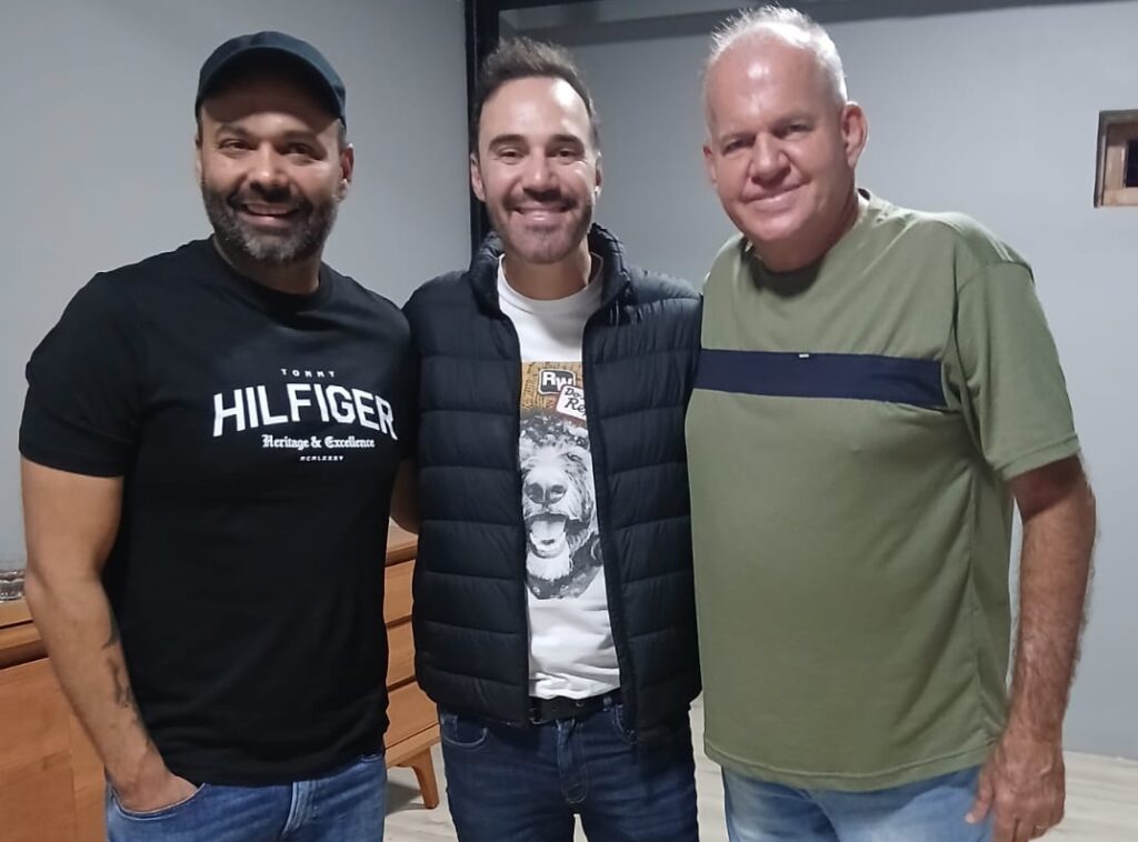 O empresário Ricardo Barros Mendes no camarim com Diogo Portugal e Serginho França, antes do show.