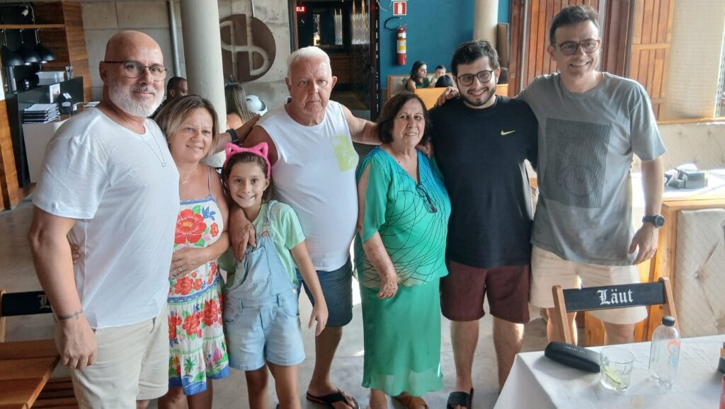 Animado almoço no Restaurante Stone House, com a família do vereador Vinícius Madaleno. Na foto ao lado de sua esposa Tininha e da filha Gabriela, além dos pais Darcy Madaleno e Dirce Barroso, a matriarca, com Felipe e Carlos Eduardo Madaleno.