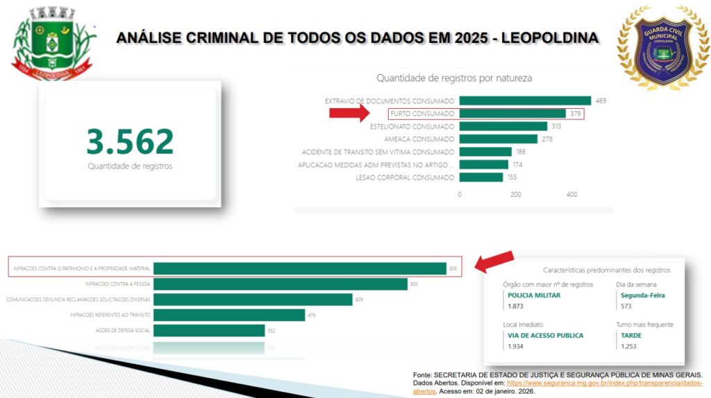 Os dados utilizados na análise são provenientes da base de Dados Abertos da Sejusp-MG, com registros consolidados até o final de 2025, e servem como referência para o planejamento de novas estratégias de segurança pública no município.