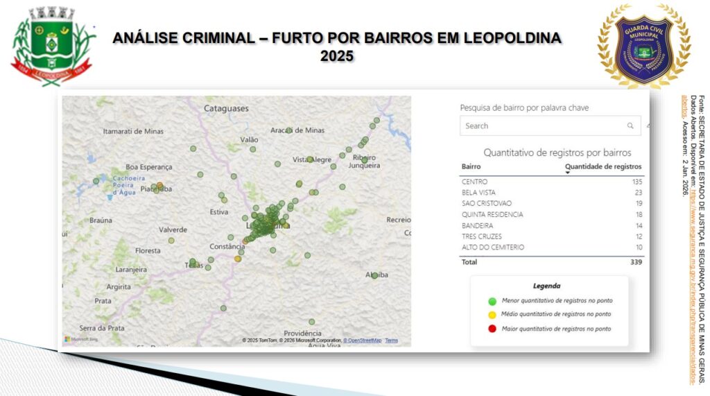 A análise por regiões e bairros mostra que, apesar da queda geral, o Centro de Leopoldina permanece como o bairro com maior número de registros de furtos, seguido por áreas como Bela Vista e outros bairros com intensa circulação de pessoas e atividades comerciais. O estudo também indica que a maior parte dos furtos ocorre em vias de acesso público, principalmente no período da manhã e da tarde, com maior incidência em dias úteis.