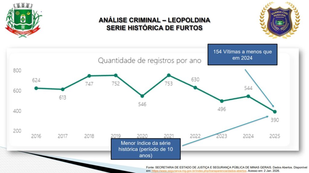 Quando o foco é especificamente o crime de furto, os dados indicam uma redução de 31,19% em 2025 em relação a 2024, configurando o menor índice da série histórica dos últimos dez anos. O levantamento aponta ainda que houve 154 vítimas a menos de furtos no município em comparação com o ano anterior.