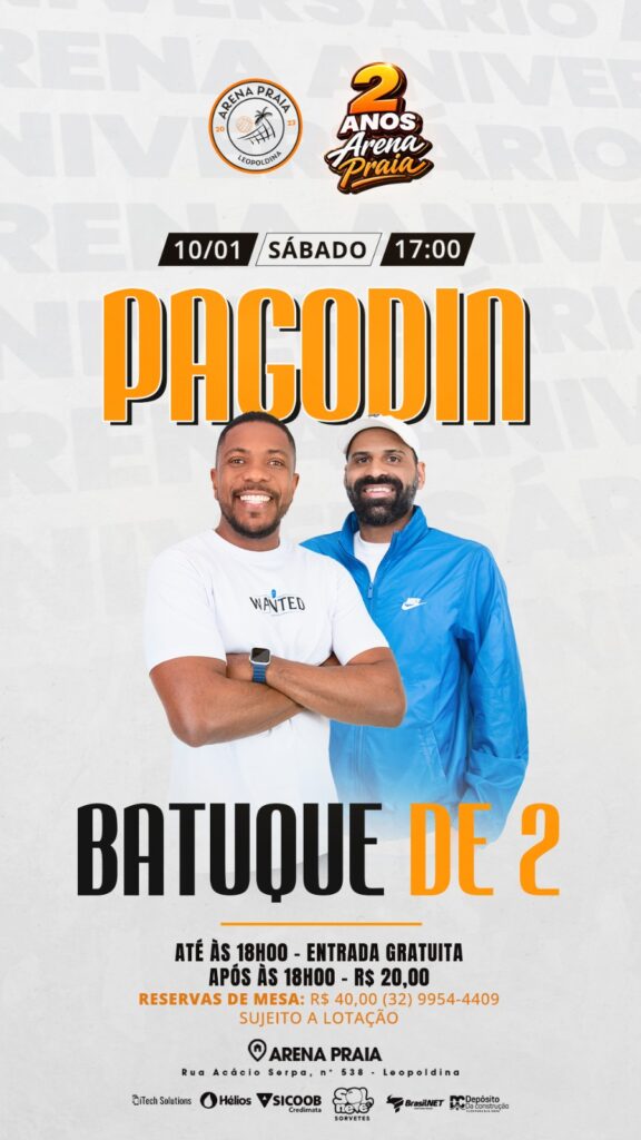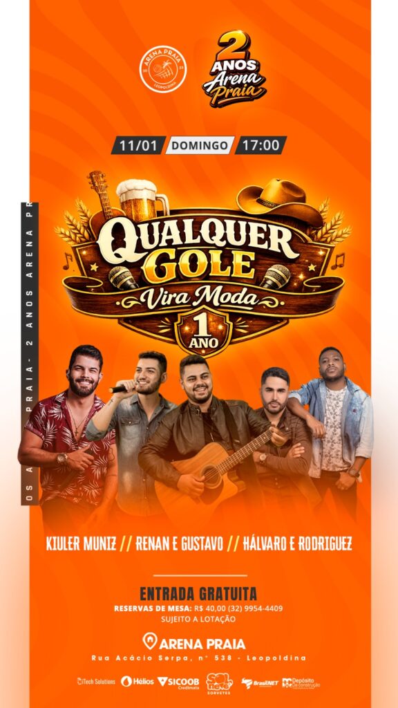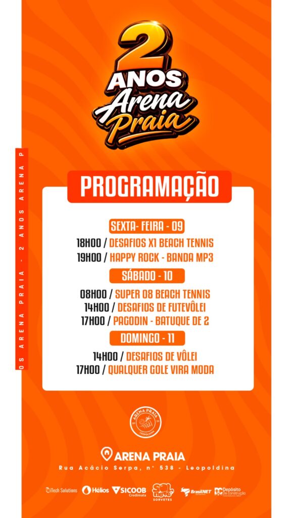 A Arena Praia de Leopoldina reforça o convite para que toda a população participe dessa grande celebração, marcada pelo esporte, pela música e pela confraternização, comemorando dois anos de atividades que já se tornaram referência na cidade.