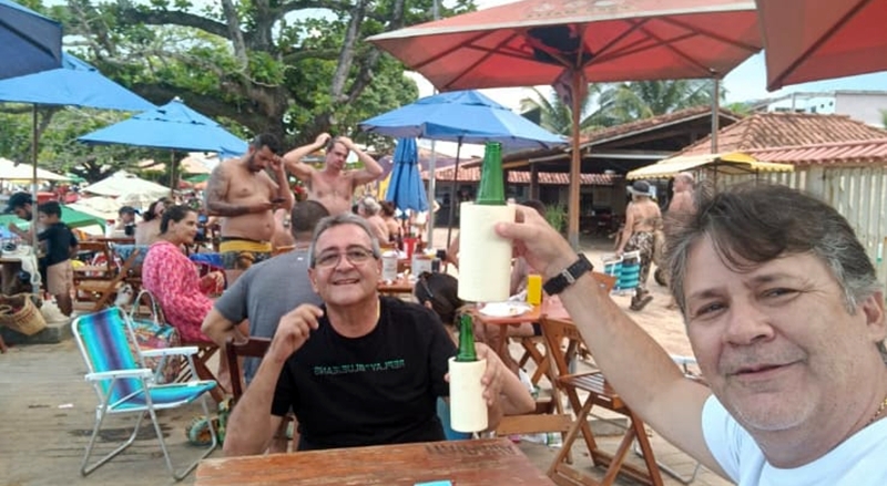Na barraca do Gonzaga, praia Costa Azul, em Iriri, os amigos Narley Ferreira (Rádio Cidade FM 104,3) e Fabinho (Bar Lamarca).