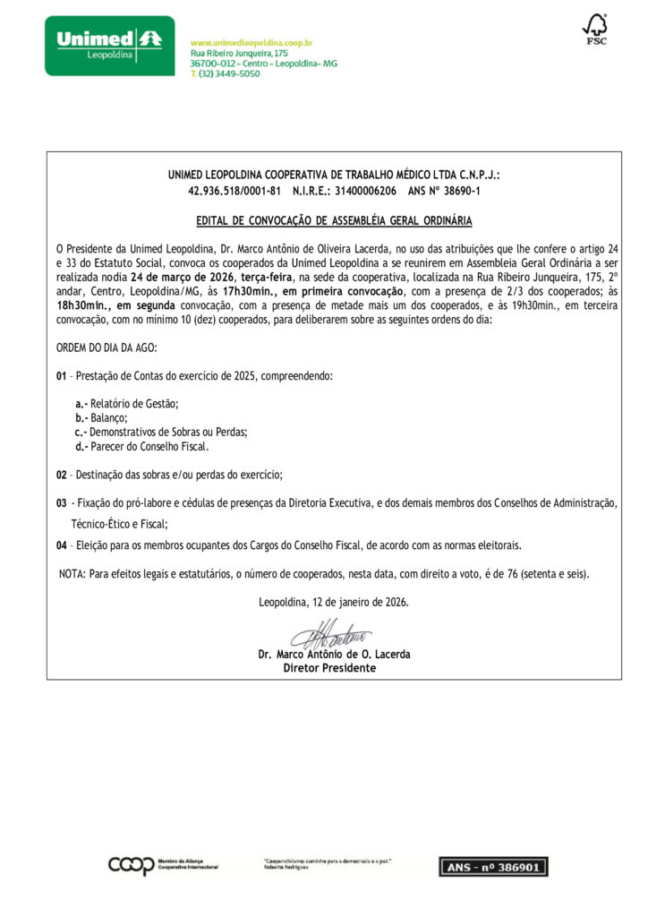 UNIMED LEOPOLDINA: Edital de Convocação de Assembleia Geral Ordinária